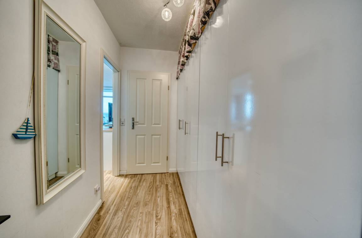 Erleben Sie erholsame Tage an der Ostsee in dieser schicken Ferienwohnung im 3. Obergeschoss des Haus B im Ferienpark Heiligenhafen. Mit ca. 45 m² Wohnfläche und großem Nordbalkon genießen Sie traumhaften Ostseeblick – ideal zum Entspannen. Die Wohnung bietet Wohn-/Esszimmer mit Couch, Essecke, TV, DVD und Radio, Schlafbereich mit Doppelbett, separates Kinderzimmer mit Etagenbett, voll ausgestattete Küche mit Ceranfeld, Backofen und Kühlschrank sowie modernes Bad mit Dusche/WC. LED-Deckenspots und Laminatboden sorgen für modernes Ambiente. Für bis zu 4 Personen geeignet, Nichtraucher, keine Haustiere. Strand, Promenade und Einkaufsmöglichkeiten sind fußläufig erreichbar.
