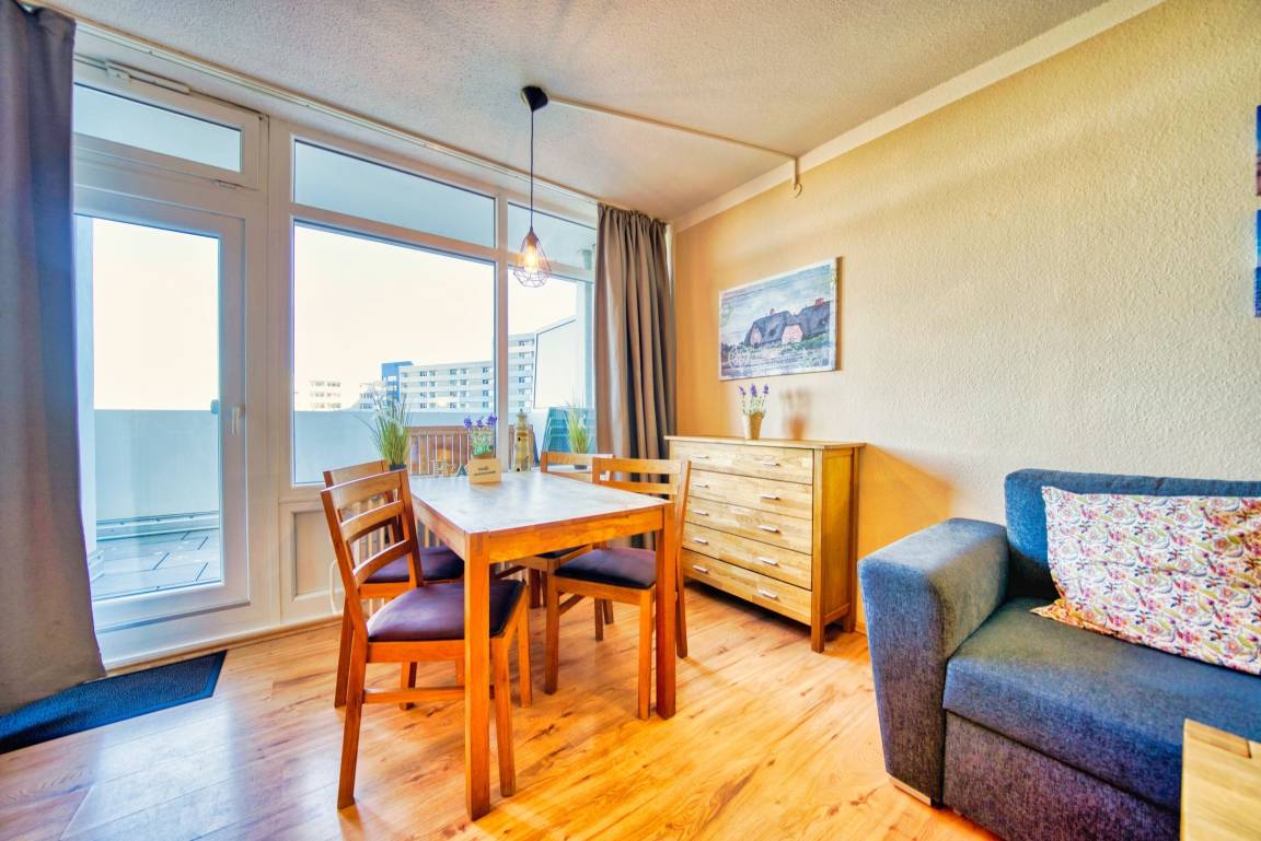 Genießen Sie Ihren Familienurlaub in dieser 4-Personen-Ferienwohnung im Ferienpark Heiligenhafen, im Haus H, Etage 3, nur 300 Meter vom Strand entfernt. Die 51 m² große Wohnung verfügt über einen großen Balkon, separaten Schlafbereich mit Doppelbett und TV, Kinderzimmer mit Etagenbett, Wohnbereich mit Smart-TV und Essplatz sowie kostenfreies WLAN. Die Küche ist voll ausgestattet mit Backofen, 2er-Induktionskochfeld, Mikrowelle, Geschirrspüler und Kühlschrank mit Gefrierfach. Das Bad bietet WC, Dusche und Handtuchtrockner. Nichtraucherwohnung, keine Haustiere. Fahrstuhl, abschließbare Fahrradräume und kostenloser Parkplatz vorhanden. Strandkorb von Mai bis September inklusive. Aktiv-Hus, Restaurants, Einkaufsmöglichkeiten und Bäckereien in unmittelbarer Nähe.