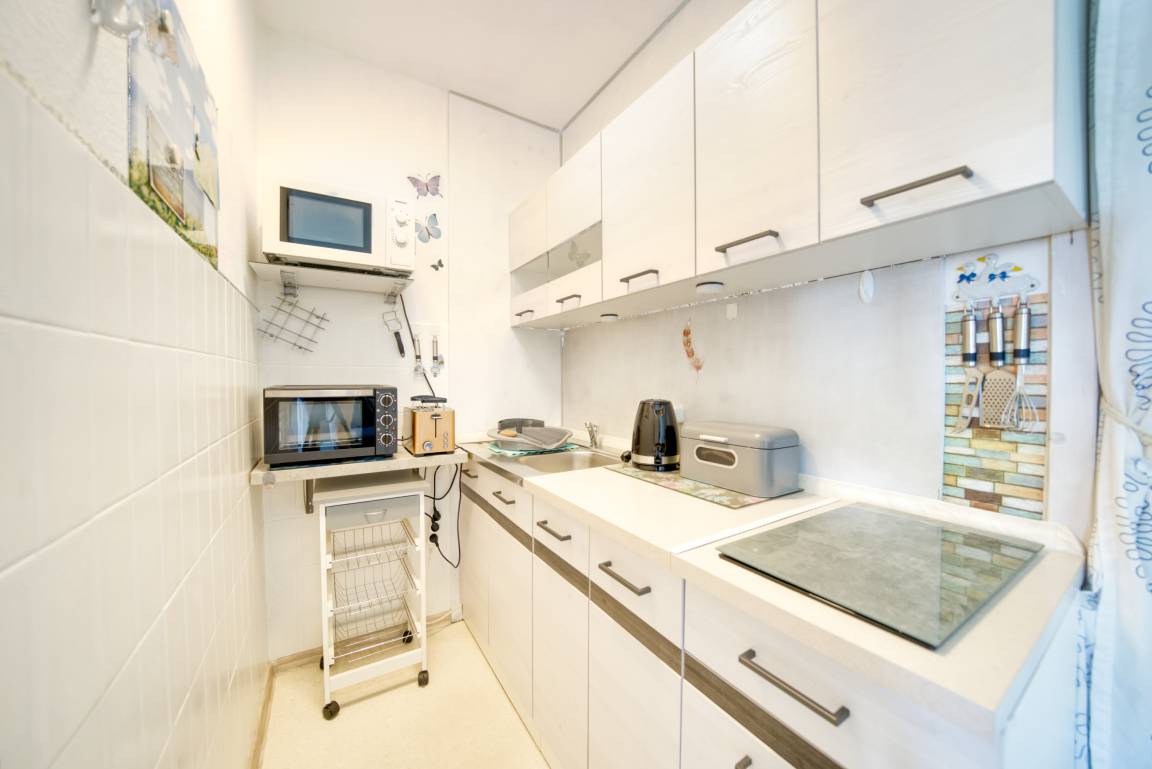 Die gut ausgestattete Küche verfügt über 2-Platten-Ceranfeld, Backofen, Mikrowelle, Kühlschrank mit Gefrierfach und Wasserkocher. Das moderne Duschbad bietet Duschkabine und Handtuchtrockner. WLAN ist kostenfrei verfügbar.