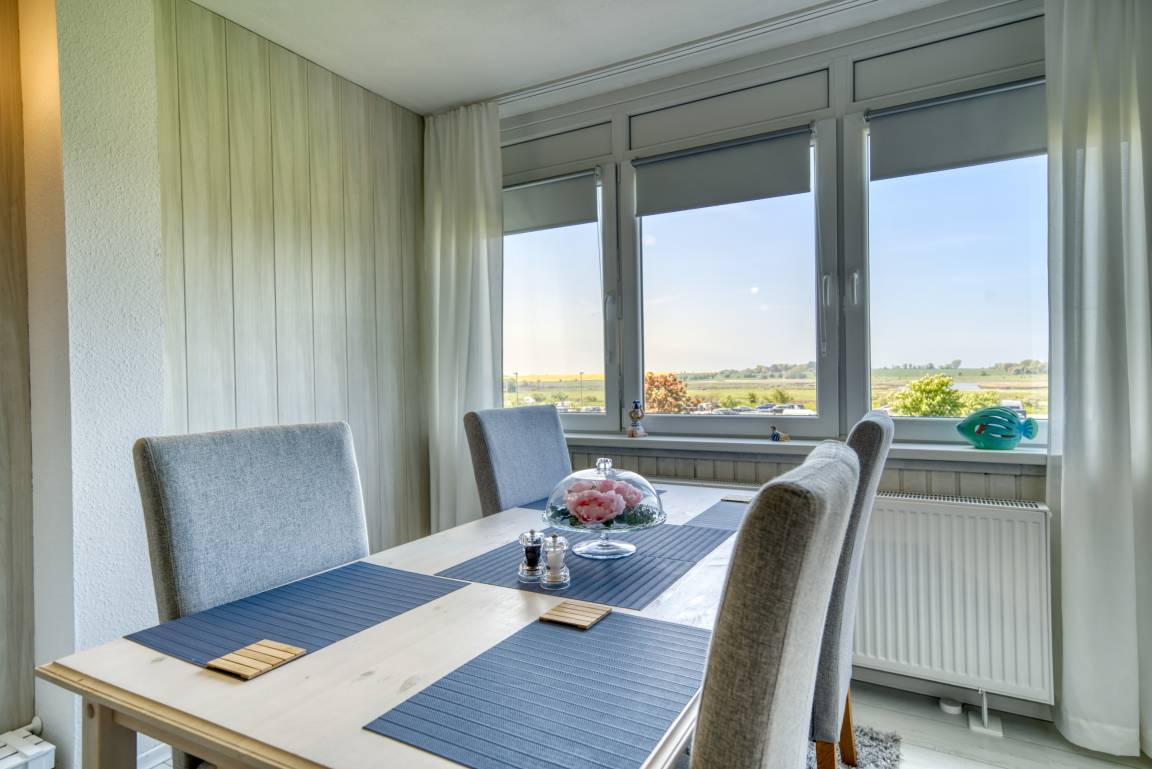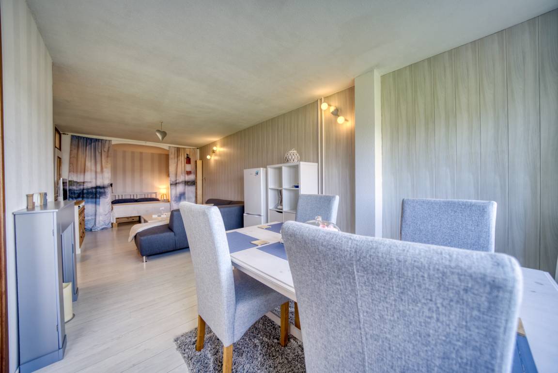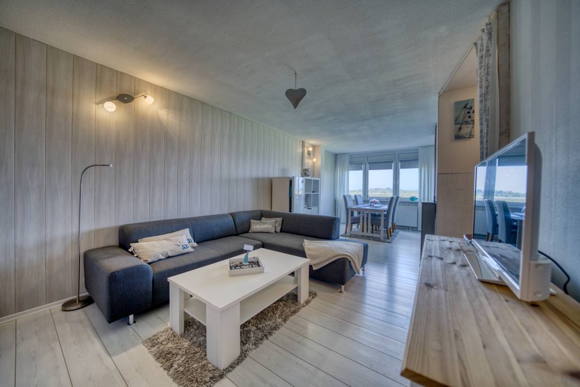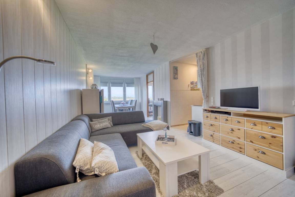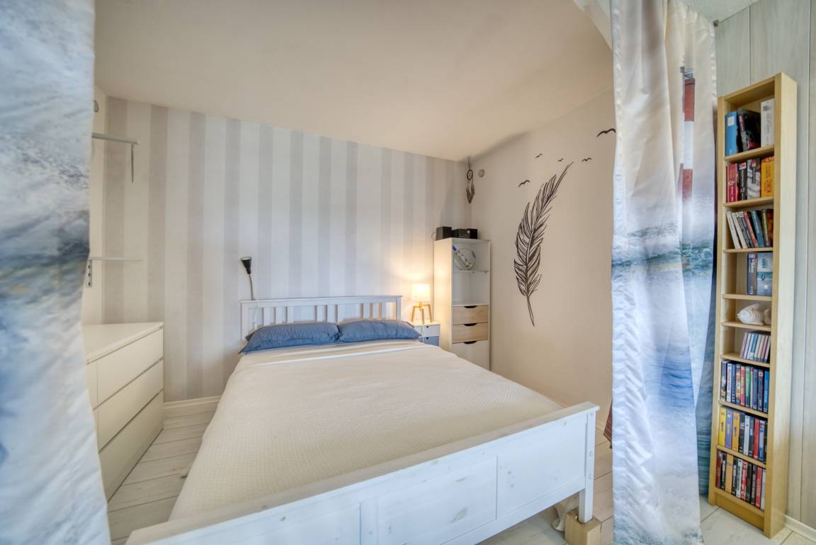 Der helle Wohn-Schlafbereich ist mit Doppelbett, gemütlicher Eckcouch, Flachbild-TV und Esstisch am Fenster (Westseite) ausgestattet. Ein separates Schlafzimmer mit Etagenbett und zusätzlichem TV ist ausschließlich für Kinder geeignet. In allen Wohnräumen liegt Laminatboden.