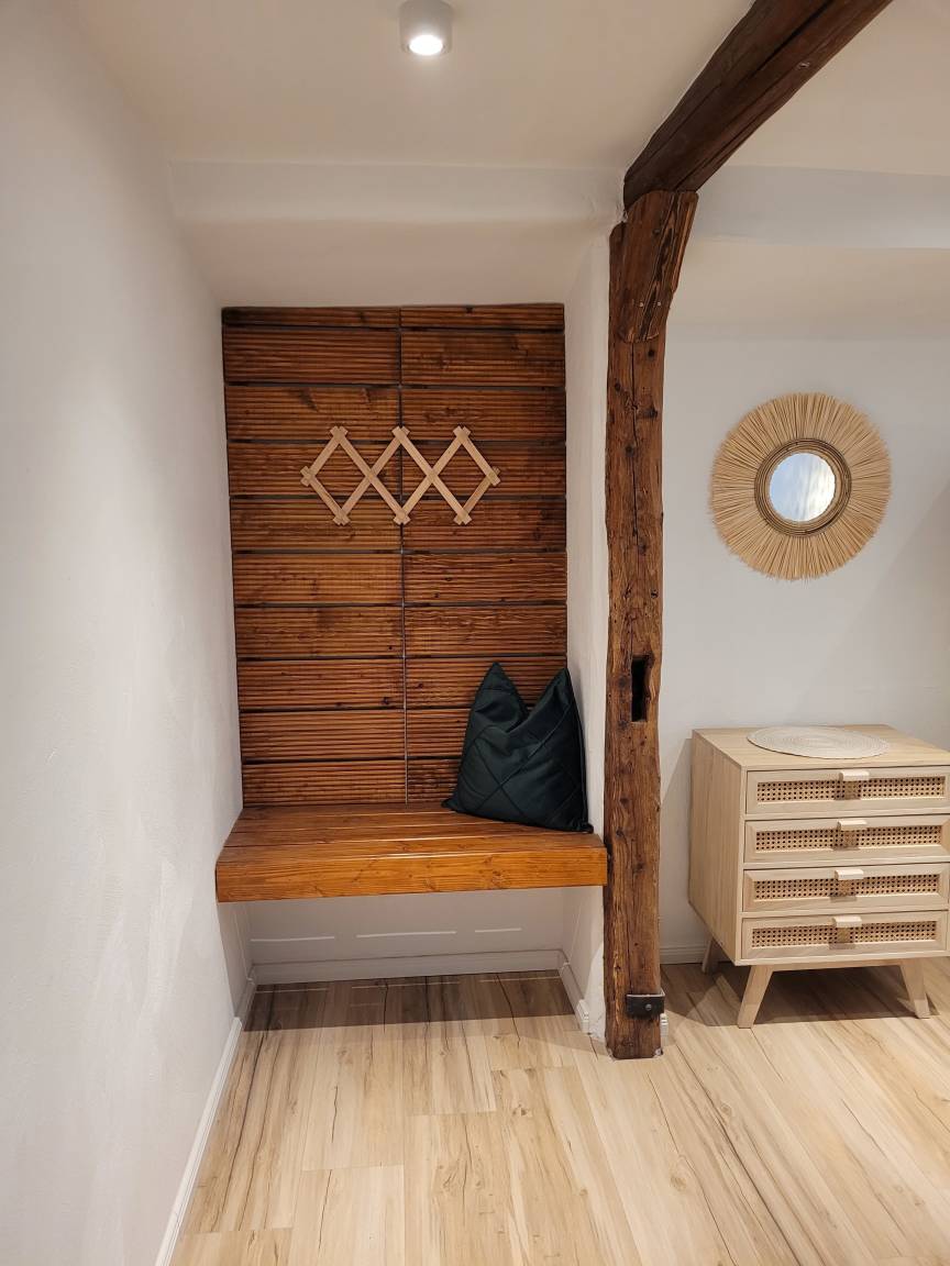 Die Sanierung der FeWo „Strandgut " wurde im Juli 2023 abgeschlossen, also „brandneu". In der Wohnung trifft der exklusive Skandi-Stil auf den gemütliche Boho-Stil, dabei verfügt die Wohnung über eine hochwertige Ausstattung. Die FeWo „Strangut" besteht aus einem Wohnzimmer mit offener Küche, welche komplett ausgestattet ist. Diese verfügt über einen Geschirrspüler, Kühlschrank, Ceranherd, Backofen, Toaster, Kaffeemaschine und Wasserkocher. Des Weiteren befindet sich im Wohnzimmer ein qualitativ hochwertiges Sofa und der gemütliche Essbereich. Das Schlafzimmer ist mit einem komfortablen Boxspringbett in Queensize-Größe plus Topper für einen erholsamen Schlaf eingerichtet. Die FeWo "Strandgut" besitzt ein einzigartiges innenliegendes Duschbad mit WC und Föhn. Das absolute Highlight der FeWo "Strandgut" ist aber der große Balkon mit Süd-West-Ausrichtung, hier kann man schöne sonnige Tage und Abende genießen, auch der Blick in den geheimen Garten lädt zum Entspannen und Erholen ein. Zur weiteren Ausstattung gehören: Flachbild-Fernseher, Radio-anlage, Wäscheständer. Ein Waschtrockner, Bügeleisen und Bügelbrett sind auch im Hause vorhanden. PKW-Stellplätze befinden sich 200 m weiter direkt am Binnensee. Ein wunderschöner Innenhofgarten mit der alten Fasswerkstatt #LostPlace und einem Grillplatz lädt zum Verweilen und grillen ein.