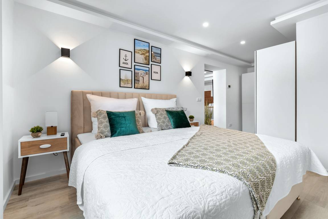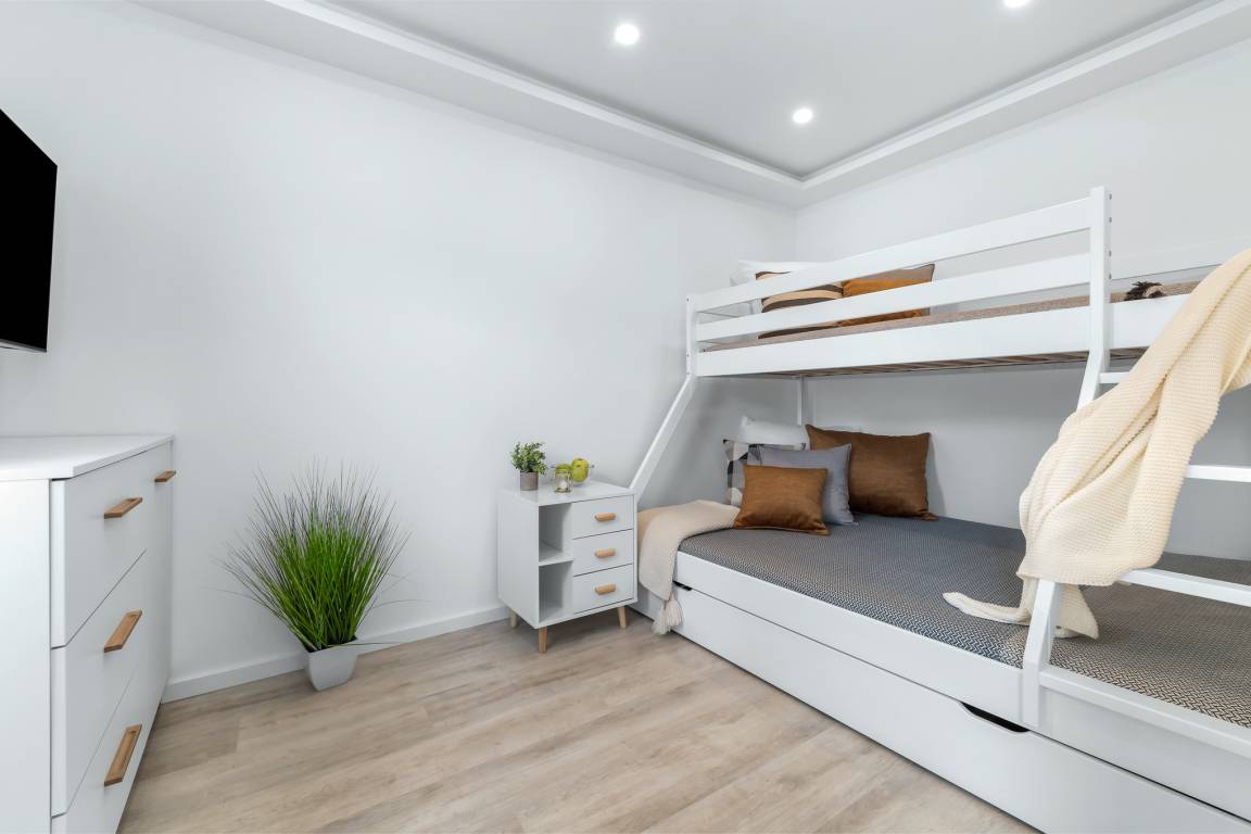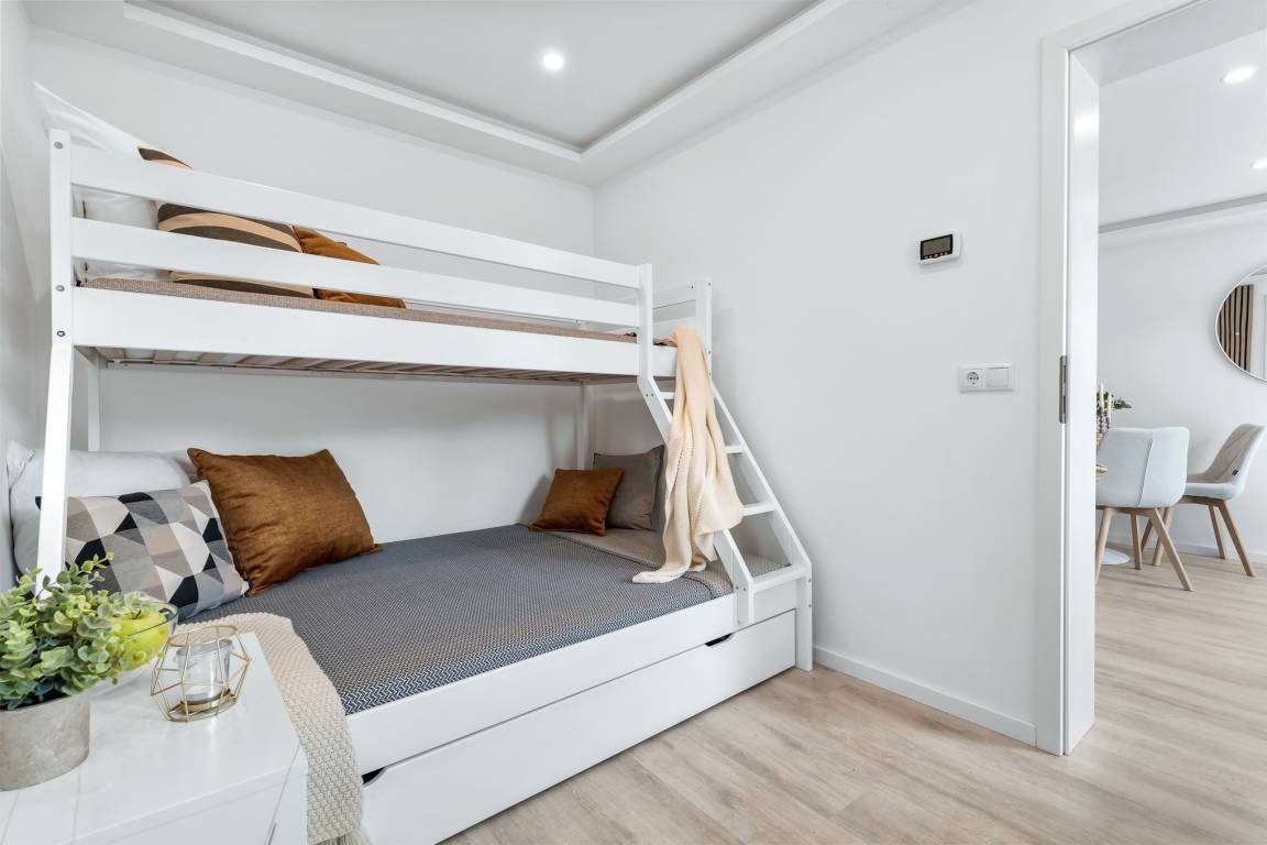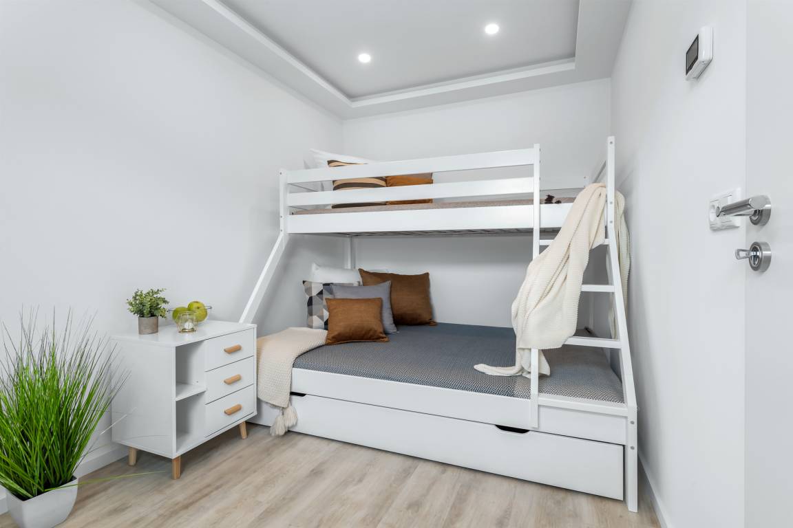 Die offene Küche ist in den Wohnbereich integriert und bietet alle Annehmlichkeiten für eine sorgenfreie Selbstversorgung. Eine Nespresso-Kapselmaschine steht ebenfalls zur Verfügung. Im Schlafzimmer erwartet die Gäste ein bequemes Doppelbett (180x200) und ein zusätzlicher Fernseher. Der große Kleiderschrank bietet ausreichend Platz für Kleidung. Im zweiten Schlafzimmer befindet sich ein Etagenbett (geeignet für Kinder), das auch ausziehbar ist. Hier können bis zu 3 Kinder schlafen. Elektrische Außenjalousien sorgen für Verdunklung und Sichtschutz.