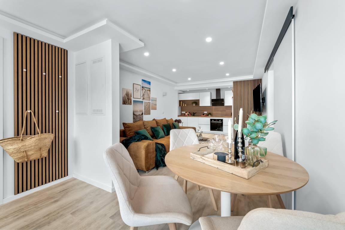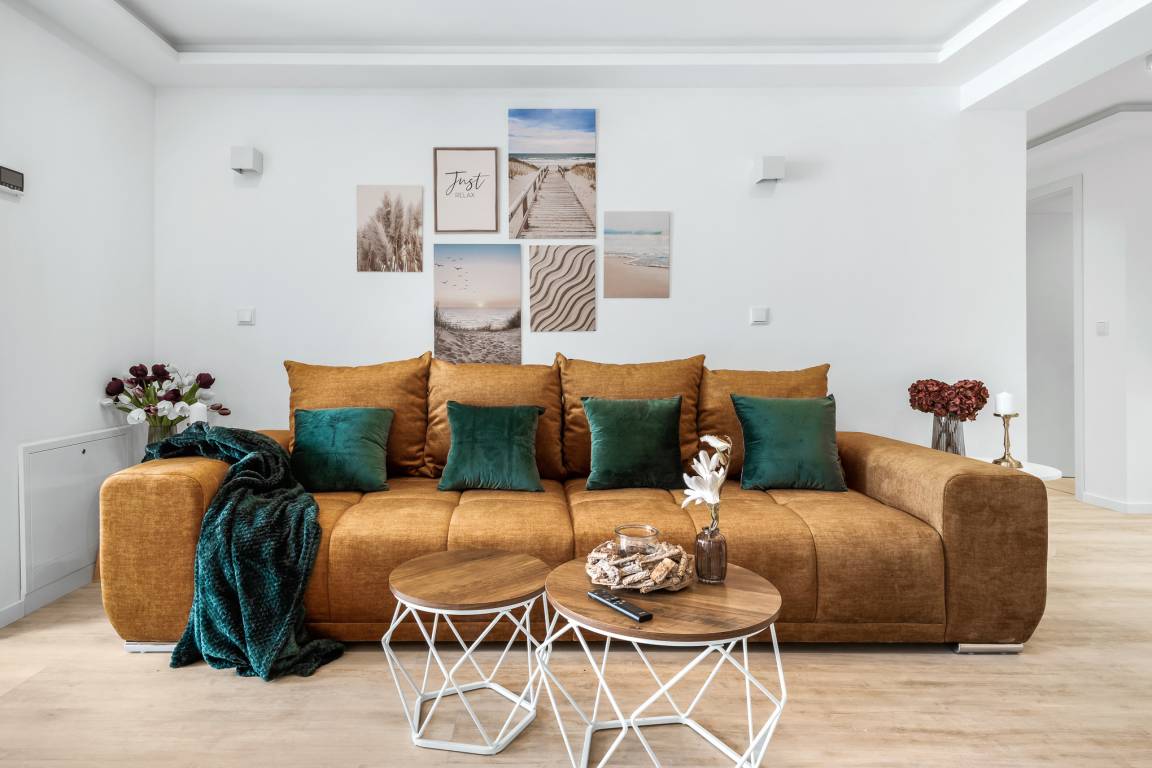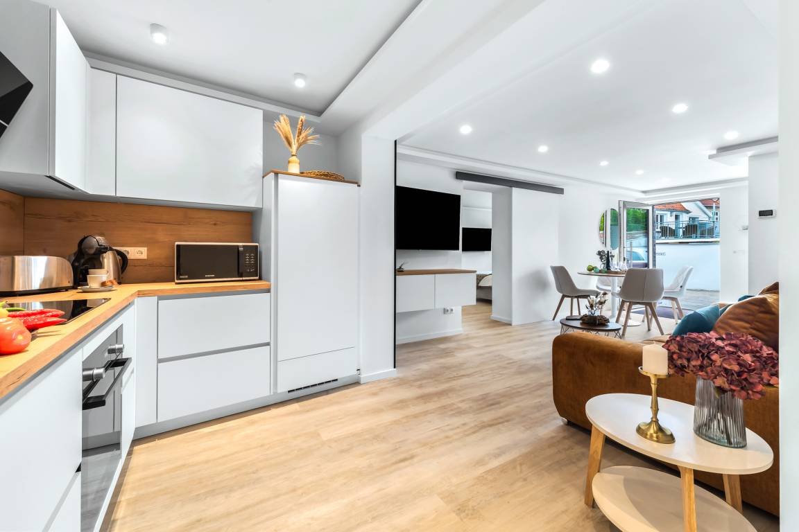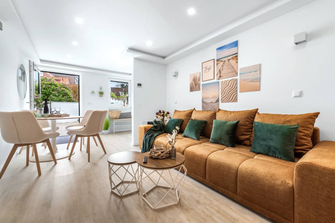 Das Herzstück der Wohnung ist der gemütliche Wohn- und Essbereich. Hier kann man auf der Couch entspannen oder gesellige Abende im Essbereich verbringen. Die geschmackvollen Farbtöne und Dekorationen schaffen eine wohnliche Atmosphäre. Zur Unterhaltung steht Streaming-TV und WLAN zur Verfügung.