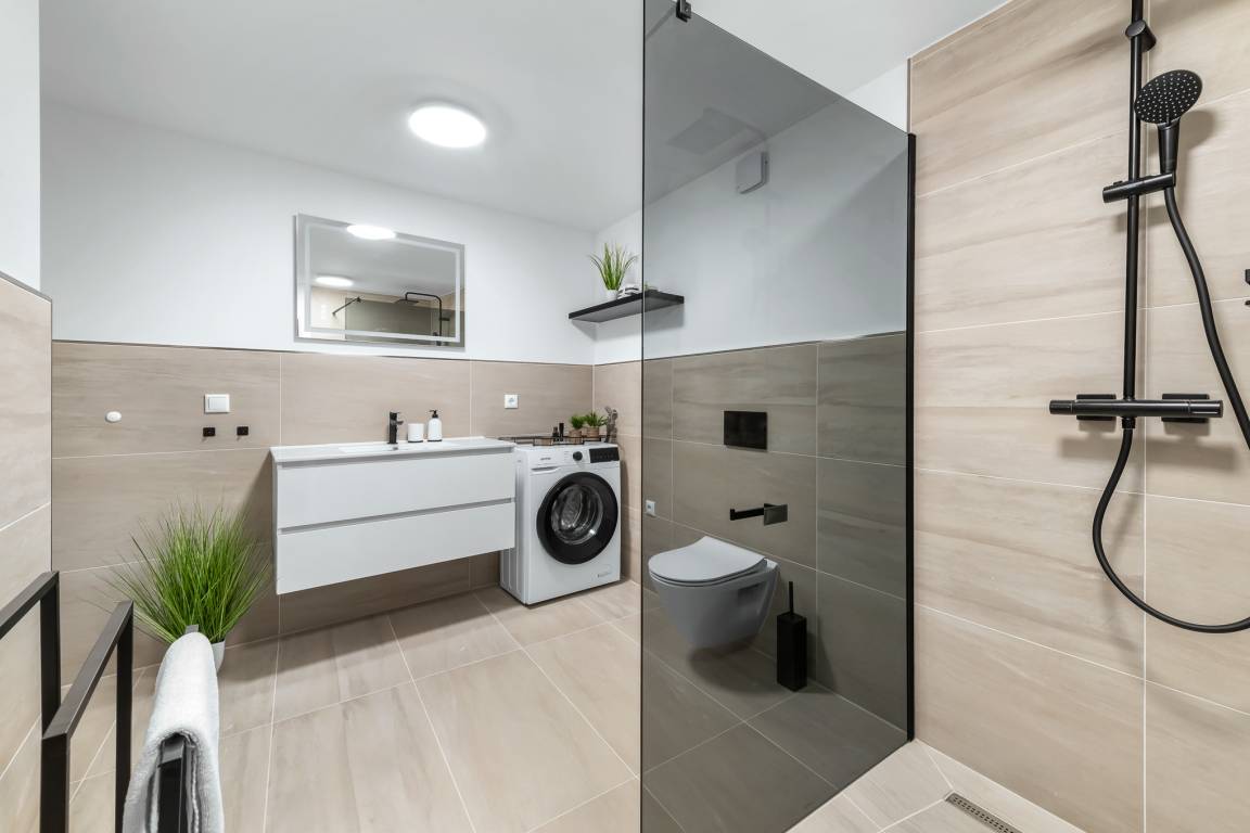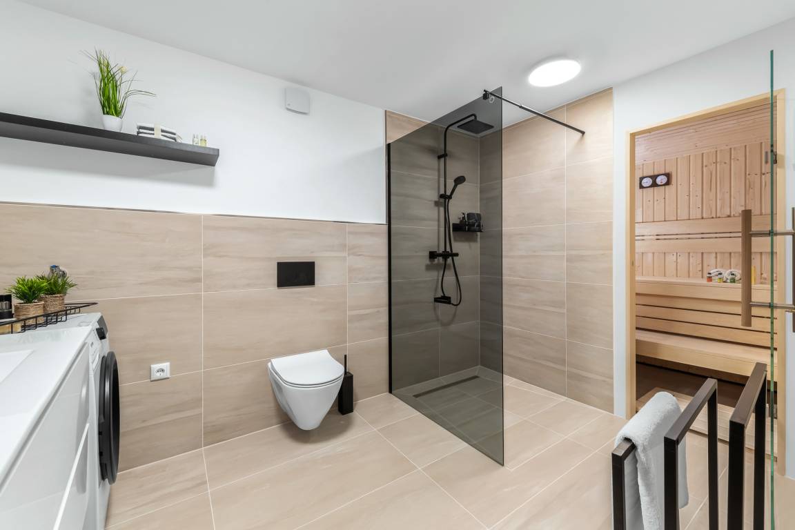 Das moderne Duschbad verfügt über eine ebenerdige Dusche, ein WC, ein Waschbecken und eine Waschmaschine. Die dort integrierte Sauna befindet sich zudem direkt neben dem Schlafzimmer und sorgt für zusätzlichen Komfort oder Zeit für Wellness.