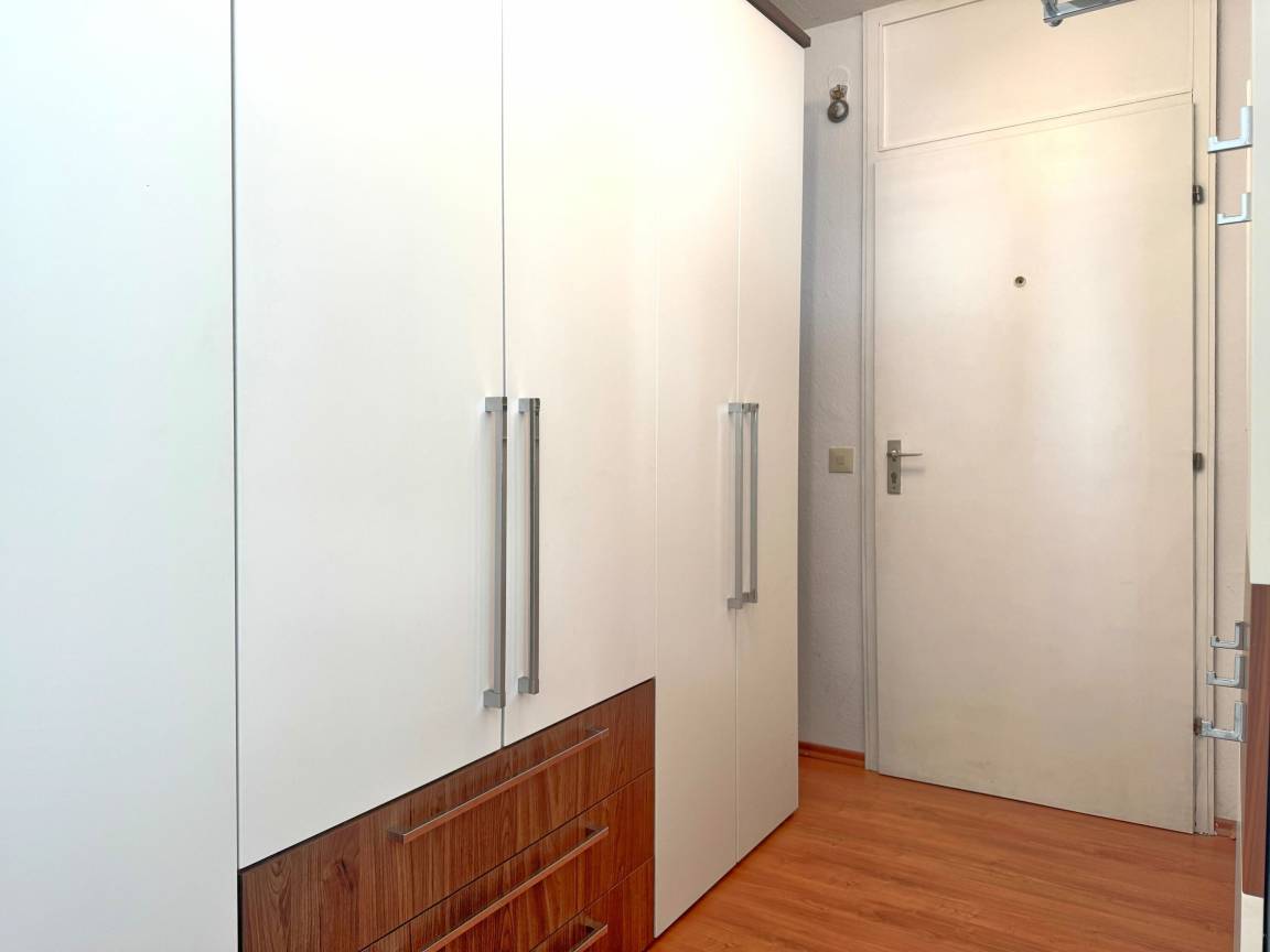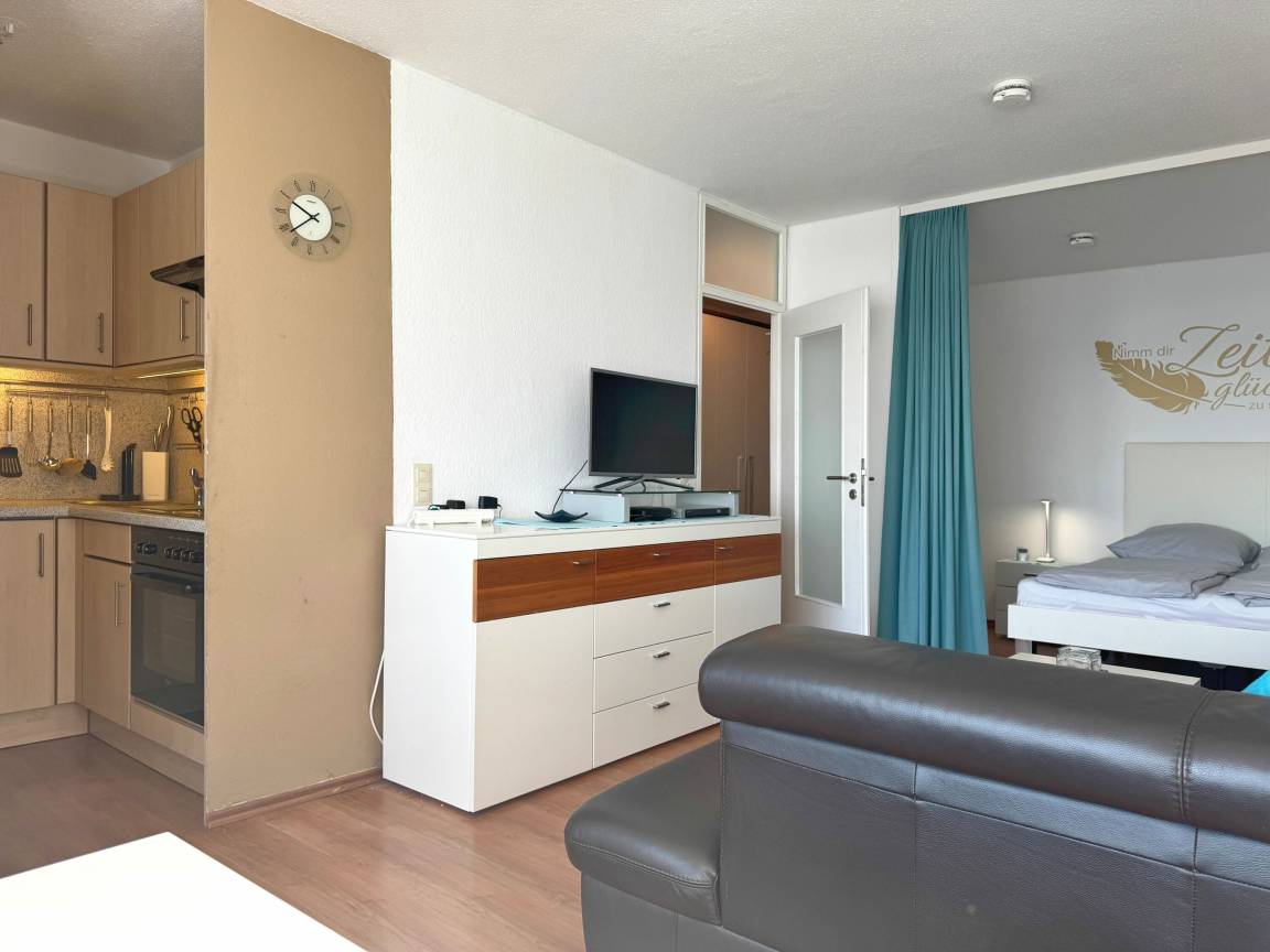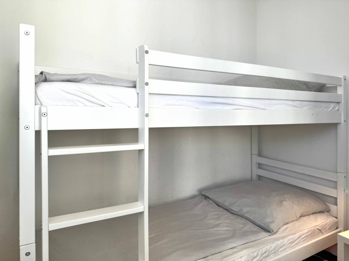 Die zweckmäßige Ausstattung des Appartements bietet alles, was Sie für Ihren Aufenthalt benötigen. Der kombinierte Wohn- und Schlafraum ist mit einem komfortablen Doppelbett ausgestattet, sodass Sie nach einem erlebnisreichen Tag zur Ruhe kommen können. Für die kleinen Urlauber gibt es ein gemütliches Kinderzimmer mit einem Etagenbett. Eines der Highlights des Wohnbereichs ist die großzügige Couchgarnitur, auf der die ganze Familie zusammenkommen kann, um einen Filmabend zu genießen oder einfach nur die Zeit miteinander zu verbringen. Der Esstisch am Fenster ist der perfekte Ort, um gemeinsam zu frühstücken, während Sie den Blick auf das Wasser genießen.