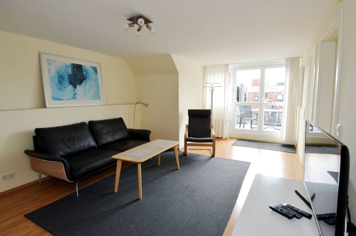 Vom Wohnbereich aus besteht Zugang zum Balkon, der einen Blick in Richtung Hafen ermöglicht. Der Balkon bietet Platz für den Aufenthalt im Freien.
