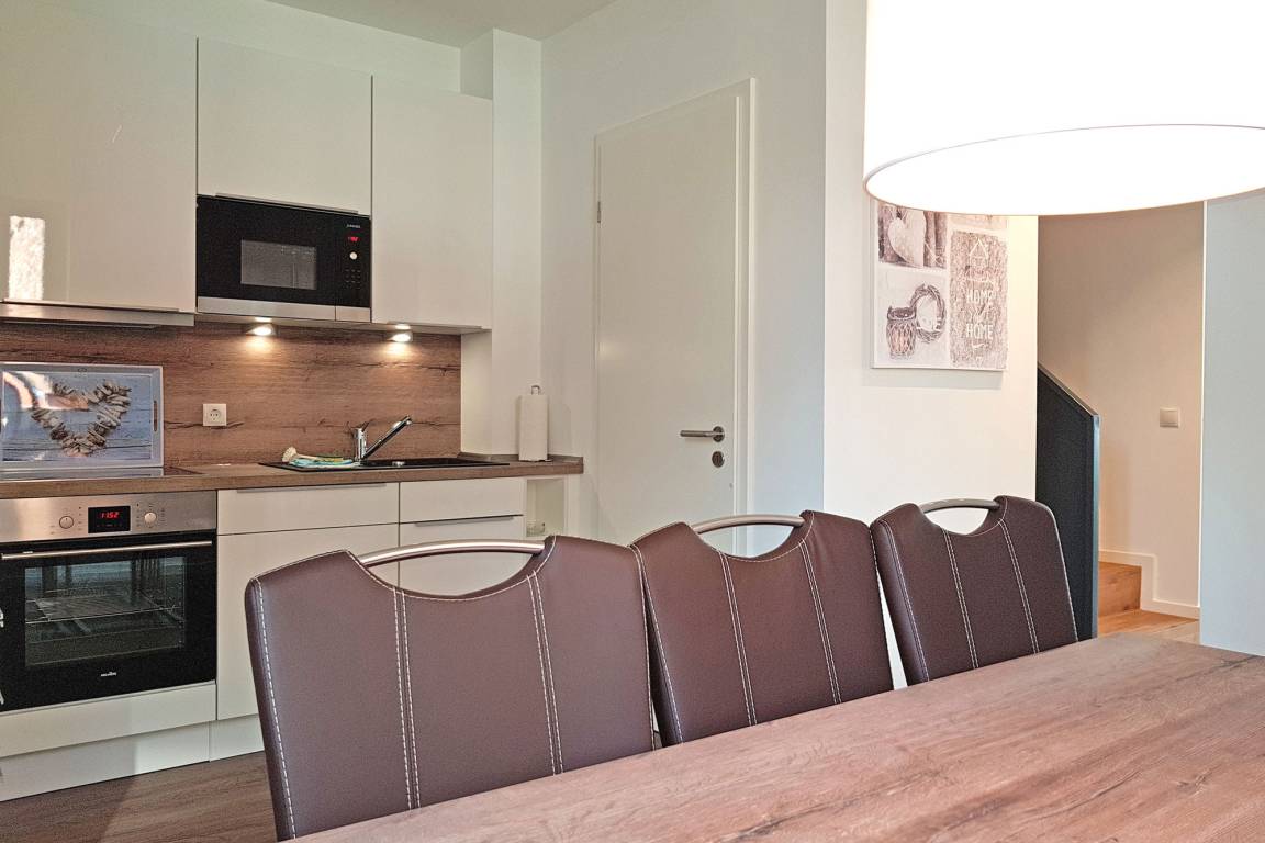 Die große, voll ausgestattete Küche mit angrenzendem Essbereich lädt dazu ein, köstliche Mahlzeiten für Ihre Liebsten zuzubereiten – sei es ein ausgiebiges Frühstück oder ein gemütliches Abendessen nach einem Tag am Strand. Praktisch: Neben der Küche befindet sich ein kleiner Abstellraum mit Waschmaschine, Trockner und Staubsauger.