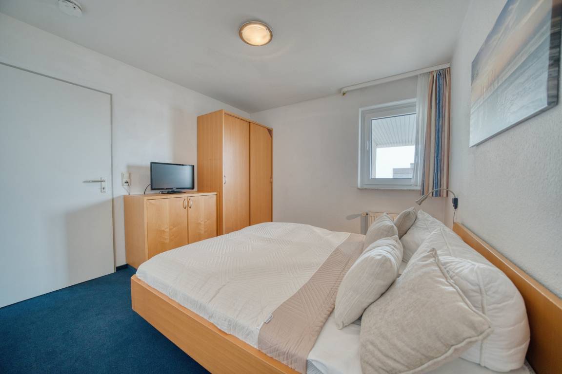 Schlafzimmer: Doppelbett, TV, Kleiderschrank