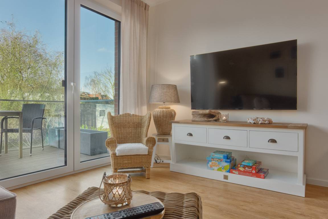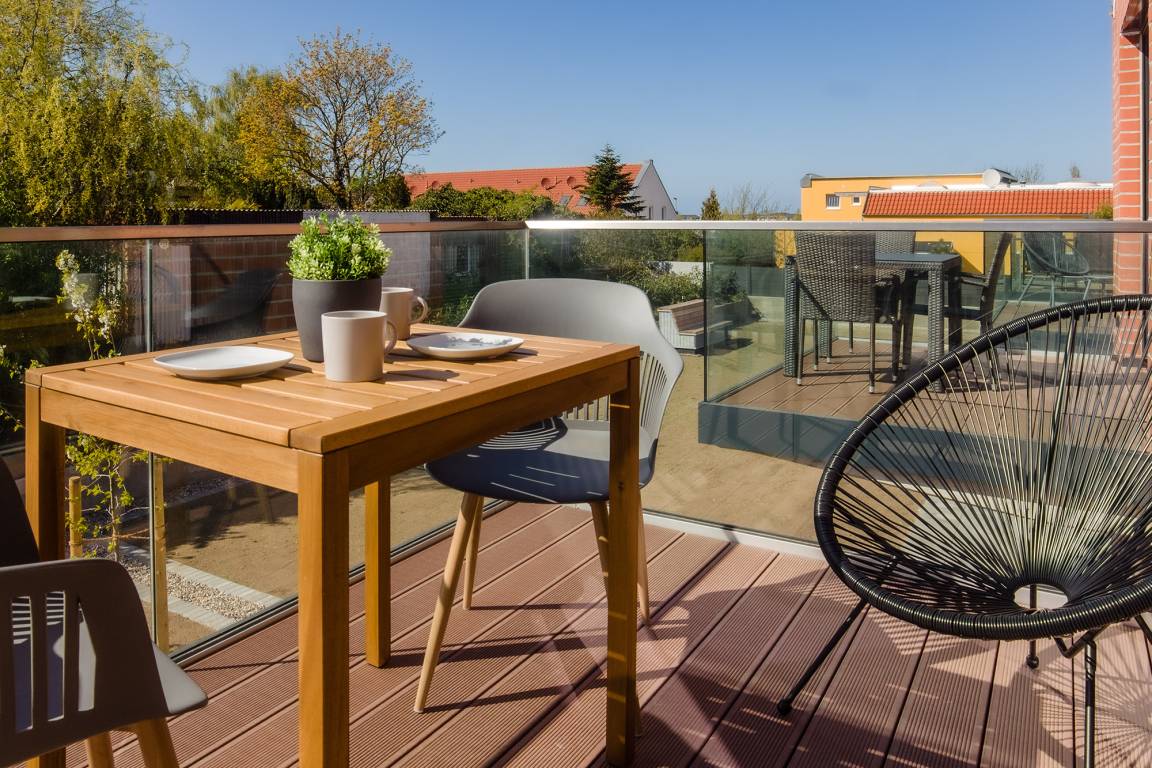 Zu den weiteren Ausstattungsmerkmalen gehören ein möblierte Balkon und ein gemeinschaftlich nutzbarer, offener Gartenbereich. Der Balkon der Wohnung schließt direkt an den Wohnbereich an. Dieser lädt dazu ein, den Tag mit einer Tasse Kaffee an der frischen Seeluft zu beginnen oder laue Sommerabende entspannt ausklingen zu lassen.