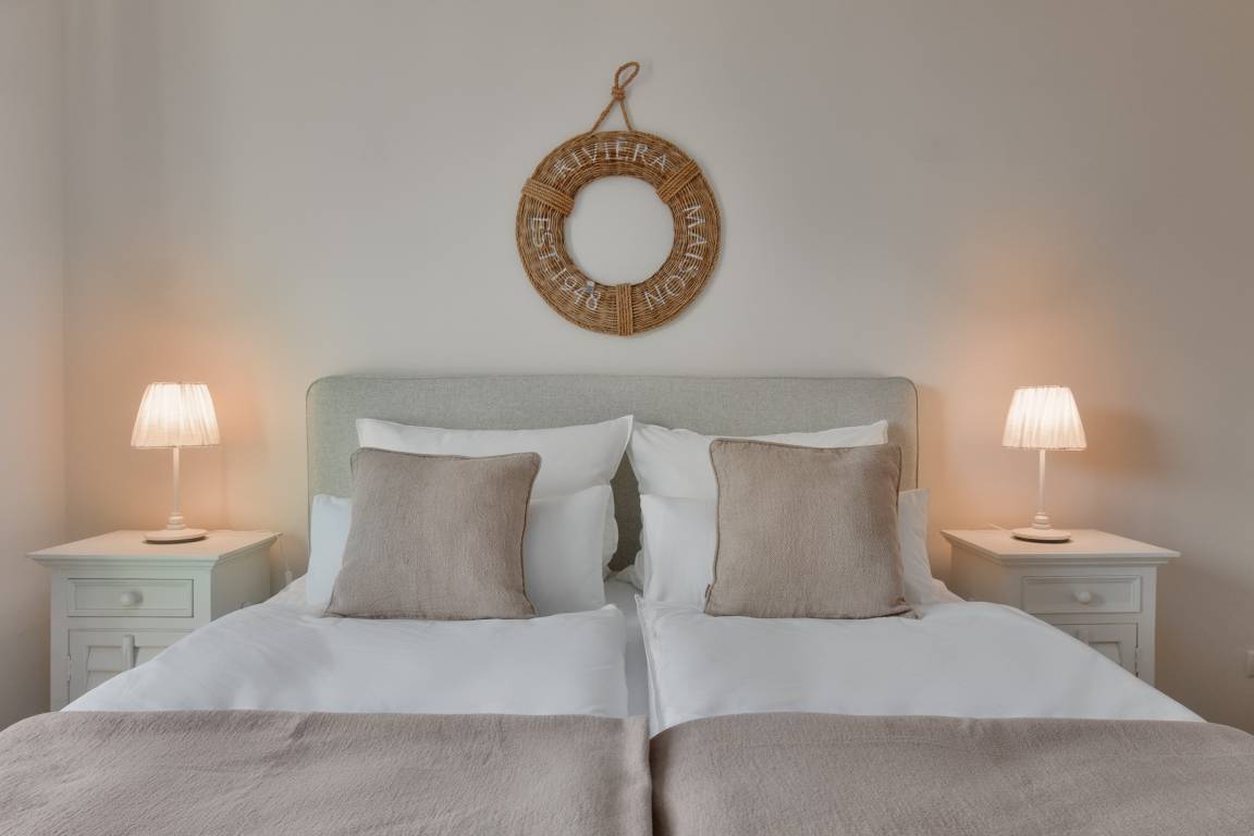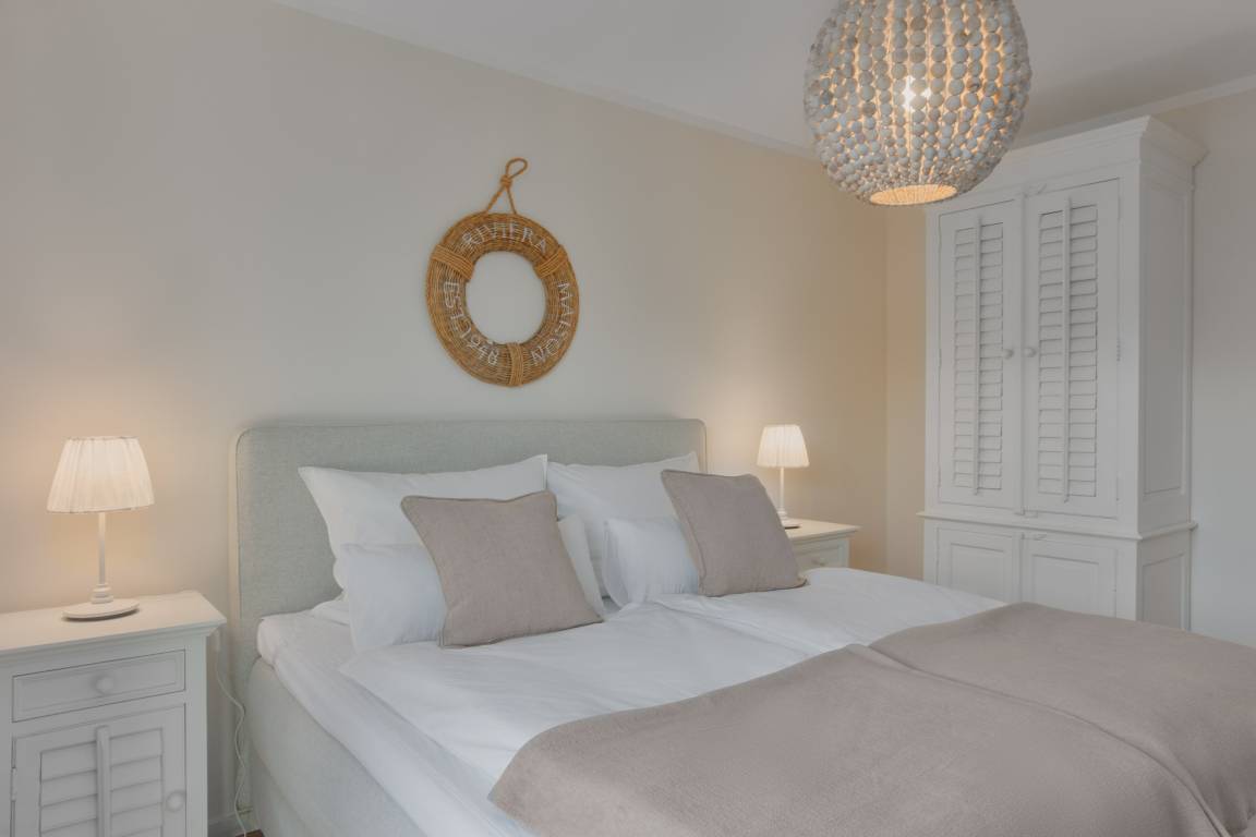Ebenso komfortabel geht es im ersten Schlafzimmer der Wohnung weiter. Hier wartet ein einladendes Doppelboxspringbett (180x200) und TV. Das zweite Schlafzimmer hat ein Etagenbett (90x200, maximal 120kg je Liegefläche, optimal für Kinder).