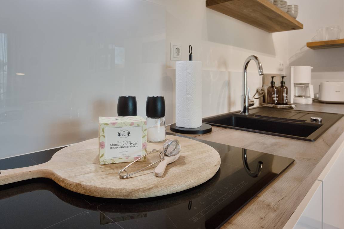 Auch die Küchenzeile wurde in den Wohnbereich integriert. Modern und durchdacht gestaltet, bietet Ihnen die Einbauküche alle Annehmlichkeiten für eine sorgenfreie Selbstversorgung.