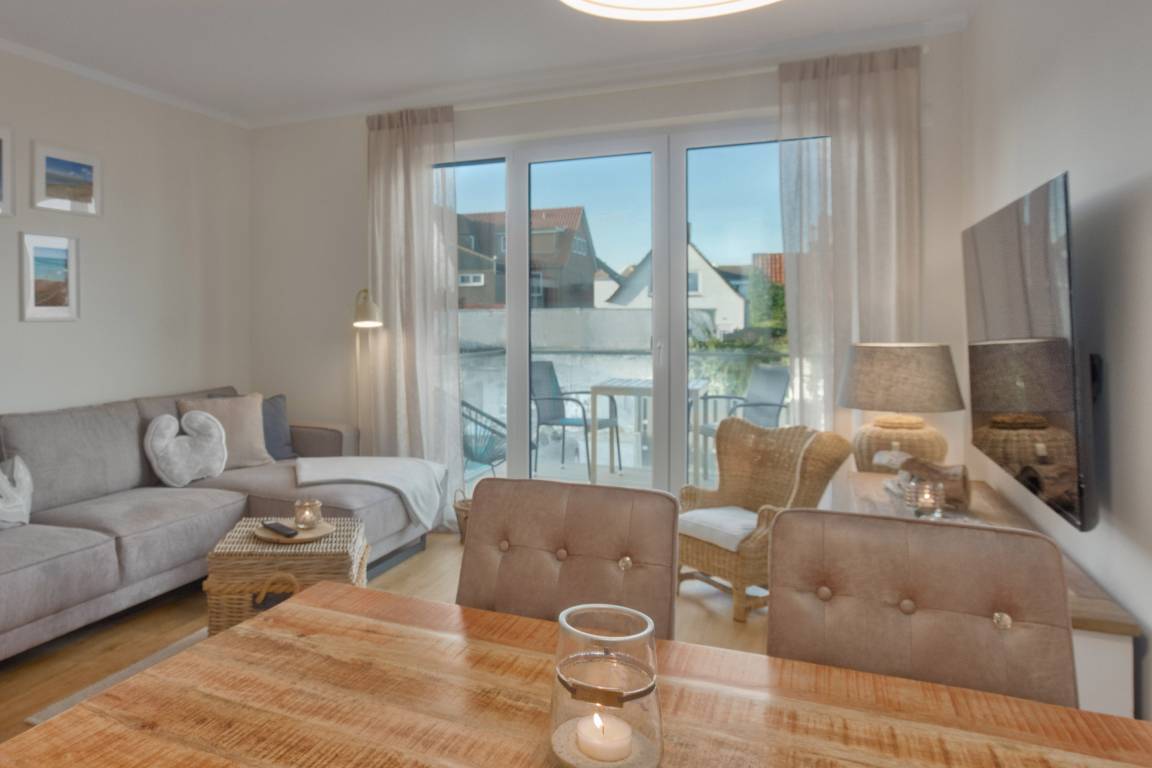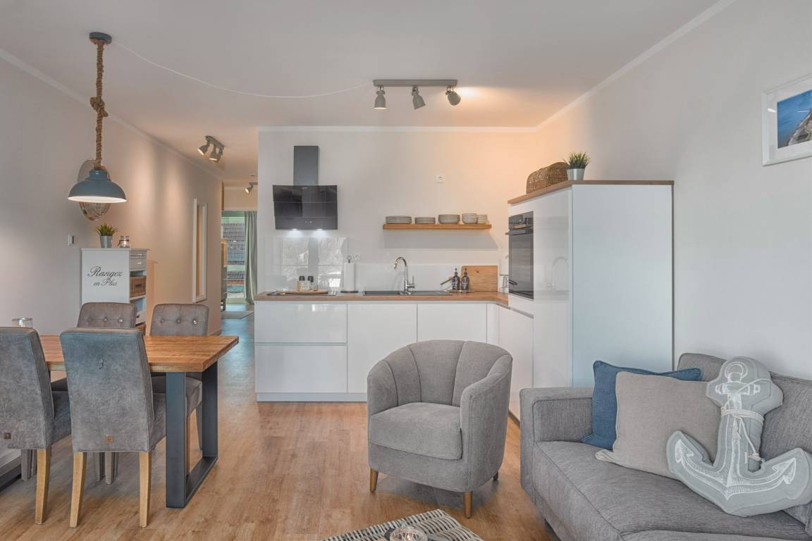 Herzstück ist der einladende Wohn- und Essbereich. Hier kann auf der gemütlichen Couch entspannt werden oder Sie genießen gesellige Stunden am Esstisch. Naturtöne und mit viel Geschick ausgewählte Dekorationen sorgen für ein wunderbar wohnliches Gefühl. TV und WLAN sind selbstverständlich. Durch die großen, charmanten Fenster haben Sie einen Blick in die Außenanlage vom Harbour Side Heiligenhafen.