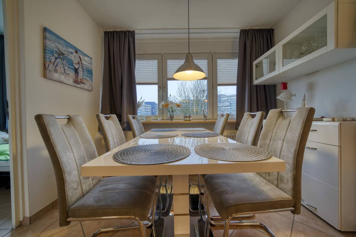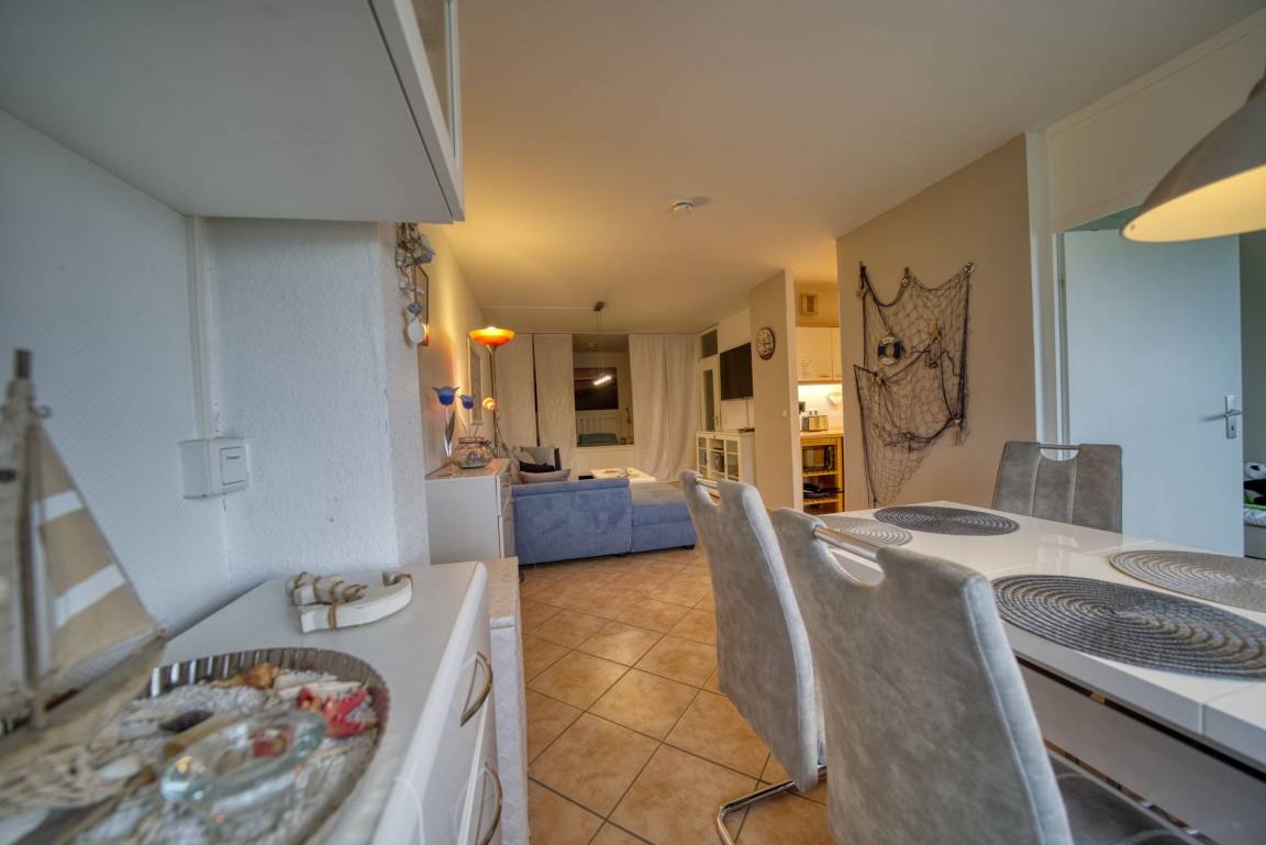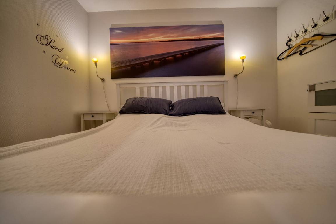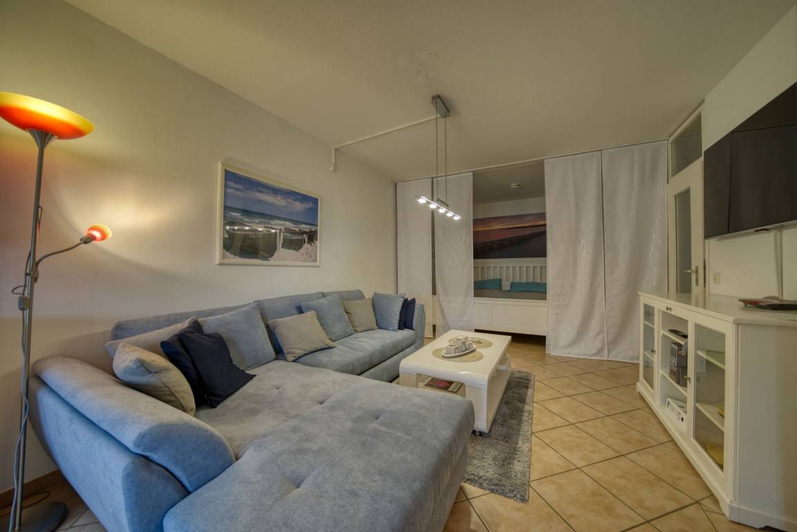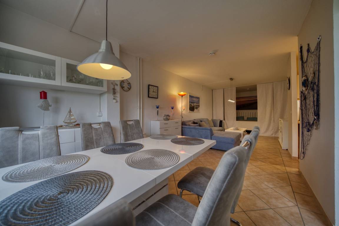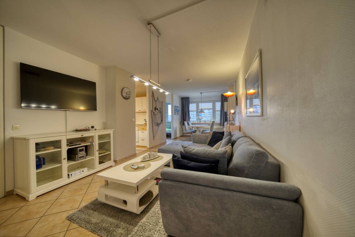 Die Wohnung verfügt über einen Wohn-/Schlafbereich mit Doppelbett und Schlafsofa, ein separates Schlafzimmer mit zwei Einzelbetten, Smart-TV im Wohnzimmer und TV im Schlafzimmer. Die Küche ist voll ausgestattet mit Cerankochfeld, Backofen, Kühlschrank mit Gefrierfach, Mikrowelle, Toaster, Kaffeemaschine, Wasserkocher und Geschirrspüler.