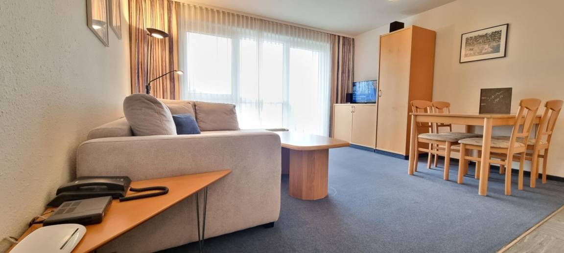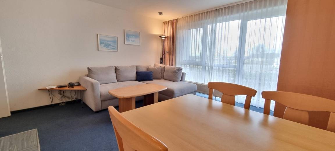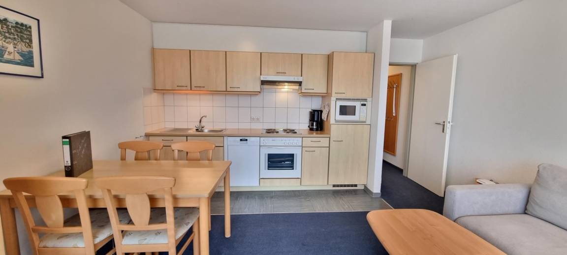 Das Appartement bietet ein separates Schlafzimmer mit Doppelbett und Kleiderschrank – ideal für erholsame Nächte. Der Wohnbereich ist mit integrierter Küchenzeile und mit einer Schlafcouch ausgestattet, die zwei zusätzliche Schlafplätze ermöglicht.