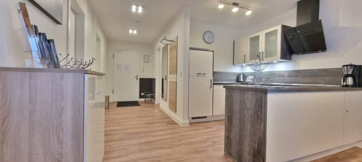 Der großzügige Wohn- und Essbereich mit offener Küche ist das Herzstück der Wohnung. Die voll ausgestattete Küche verfügt über Herd, Backofen, Kühlschrank, Geschirrspüler sowie alle notwendigen Küchenutensilien – ideal für die Zubereitung frischer Ostseegerichte oder gemütlicher Familienmahlzeiten. Direkt vom Wohnbereich genießen Sie einen seitlichen Blick auf die Ostsee, perfekt für entspannte Momente bei Sonnenaufgang oder Sonnenuntergang.