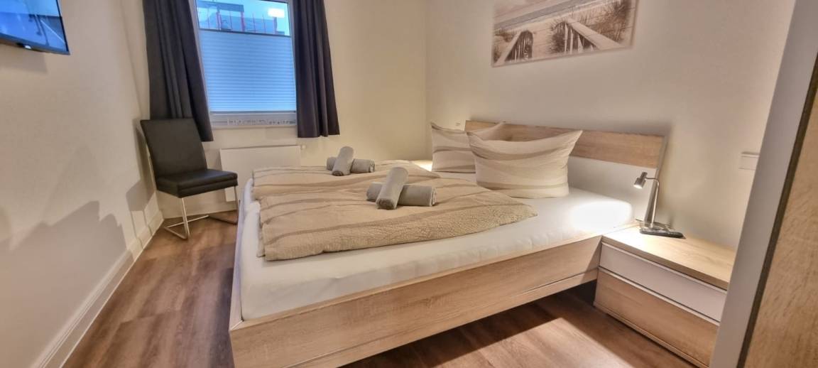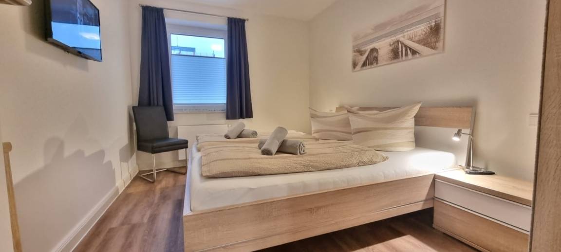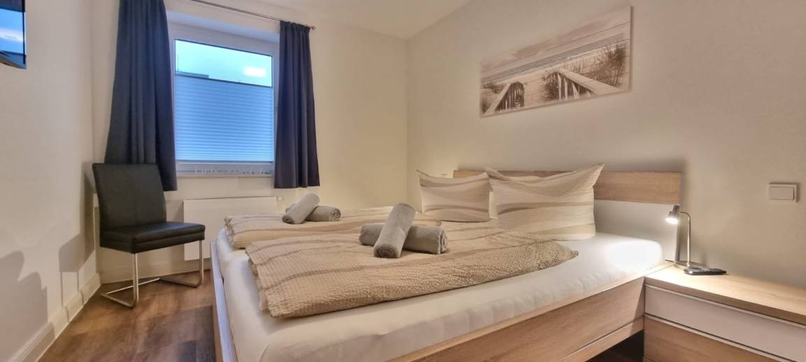 Die Ferienwohnung "Strand.Gut" bietet zwei separate Schlafzimmer, wodurch sie optimal für bis zu vier Personen geeignet ist. Das Hauptschlafzimmer verfügt über ein komfortables Doppelbett, während das zweite Schlafzimmer zwei weitere Schlafmöglichkeiten bietet. Jedes Schlafzimmer ist mit einem Flatscreen-TV ausgestattet, sodass auch in der Unterkunft Unterhaltung garantiert ist.