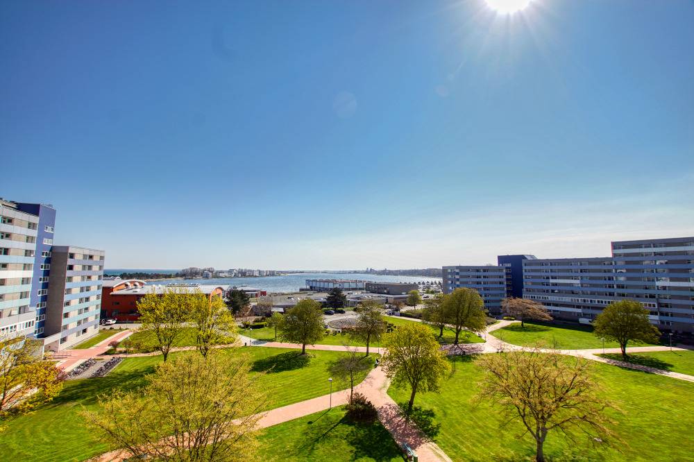 Die Ferienwohnung im Haus F, 6. Etage, mit Balkon zur Ostseite, bietet einen herrlichen Blick auf die Ostsee, den großen Binnensee, die Fehmarnsundbrücke, die Stadt und den Yachthafen.