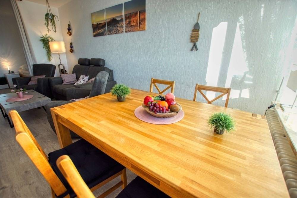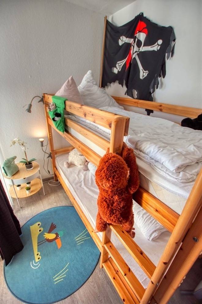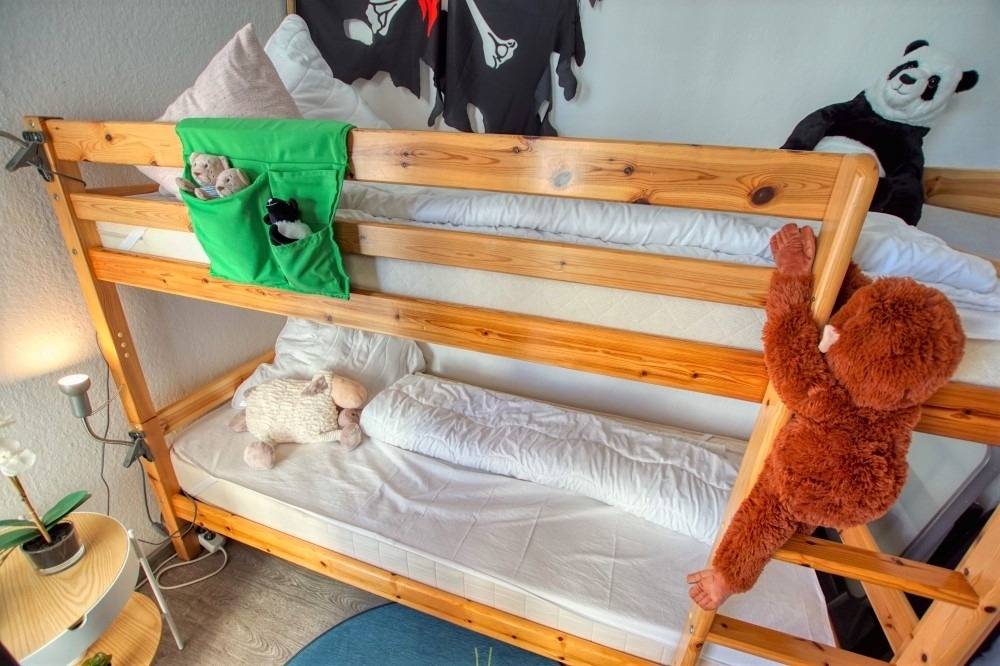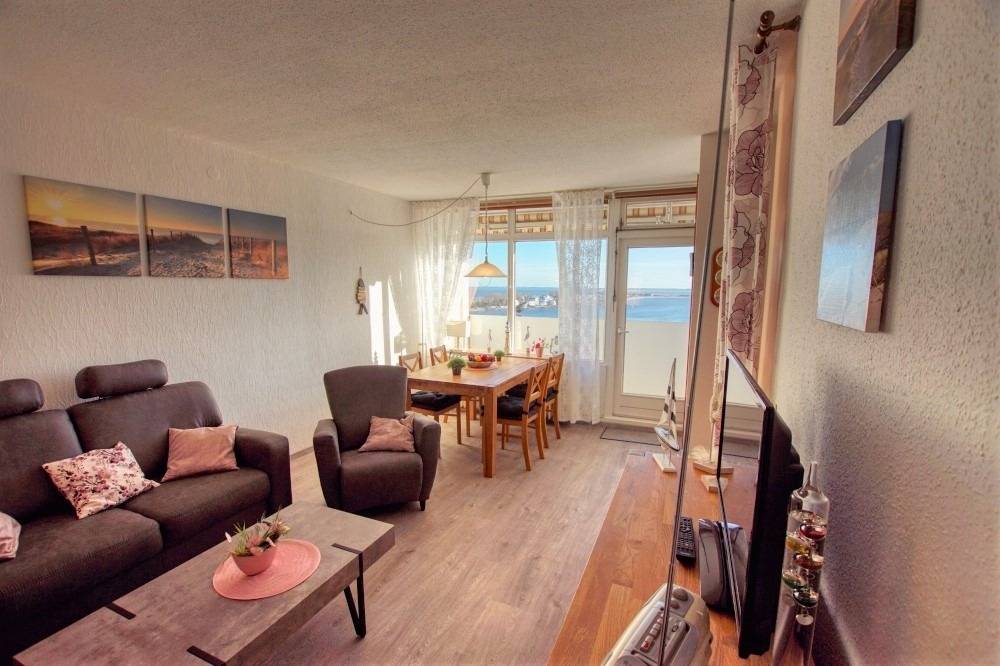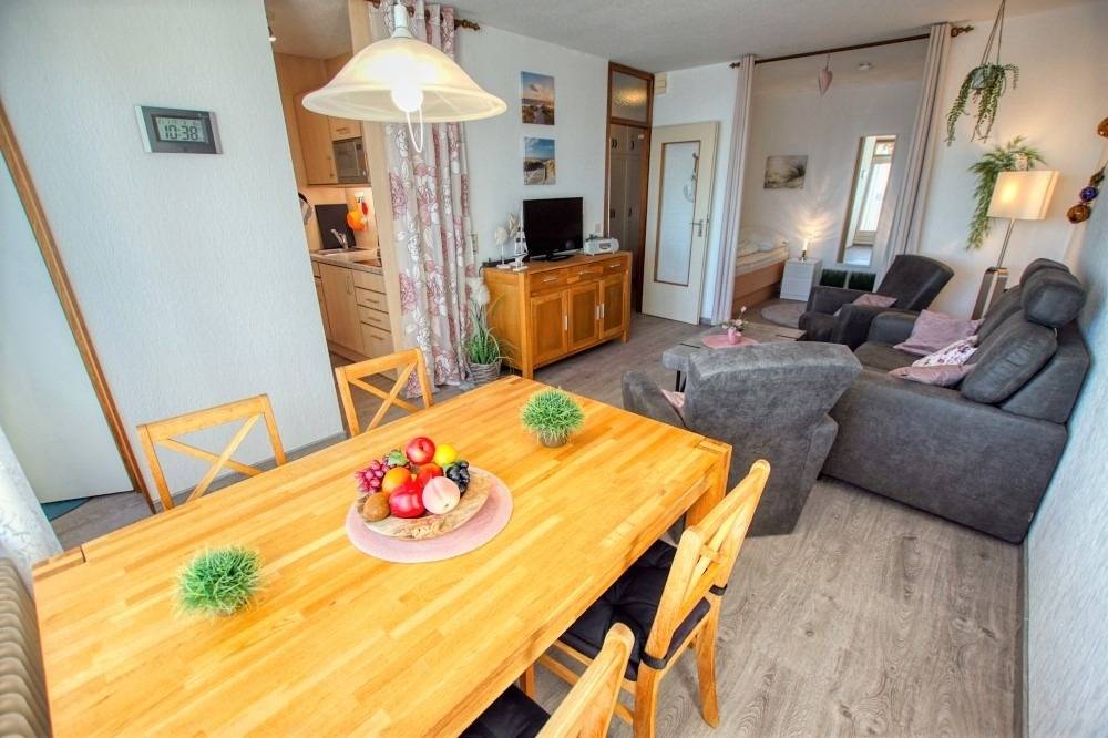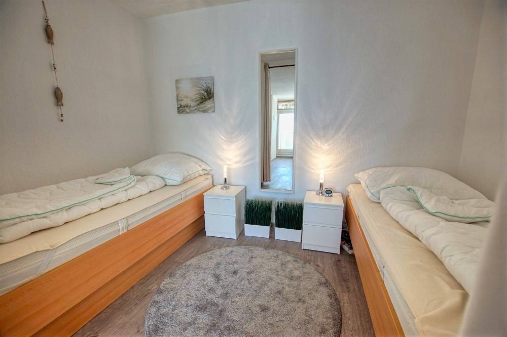 Die 45 m² große Wohnung verfügt über Wohn-Esszimmer mit Sitzecke, Elternschlafbereich mit Einzelbetten, separates Kinderzimmer mit Etagenbett, voll ausgestattete Küche (Mikrowelle, Kühlschrank, 4-Plattenherd), Bad mit Dusche/WC sowie TV und Radio. Nichtraucher, keine Haustiere, kein WLAN, Fahrstuhl, Fahrradräume, ca. 300 m zum Strand, kostenfreier Parkplatz hinter dem Ferienpark. Ideal für entspannte Tage und Freizeitangebote im Ferienpark.