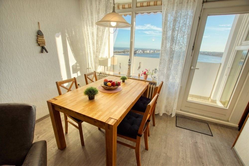 Die Wohnung liegt im Haus G Ferienpark, in der 13. Etage, mit Balkon zur Ostseite, der einen herrlichen Blick auf die Ostsee mit Fehmarnsundbrücke sowie auf den Binnensee mit Stadt und Yachthafen bietet.