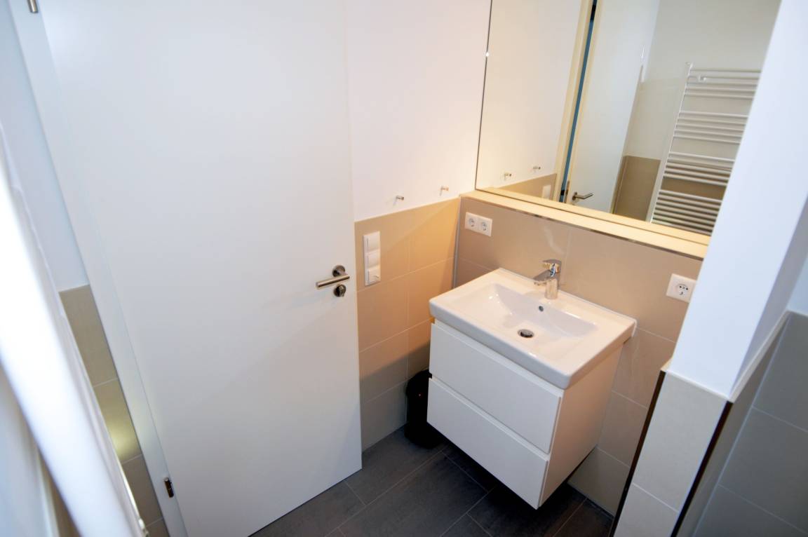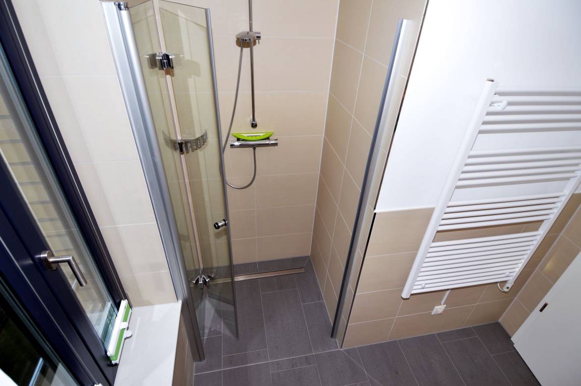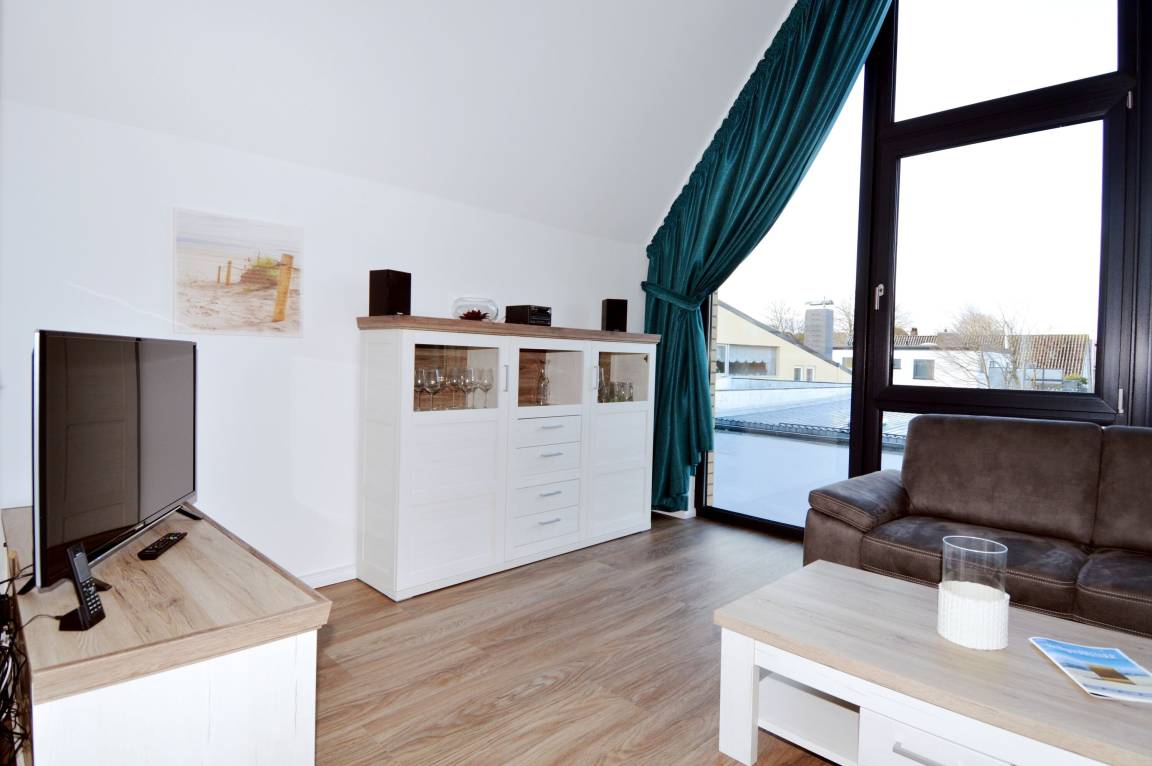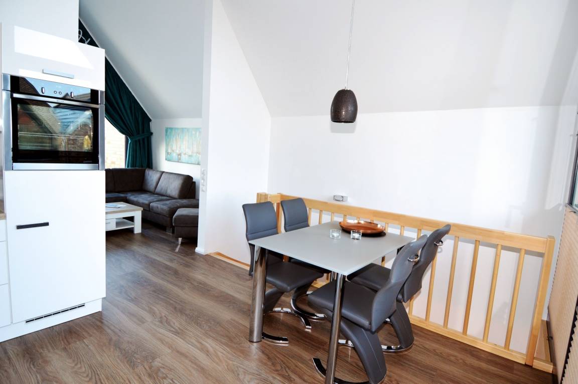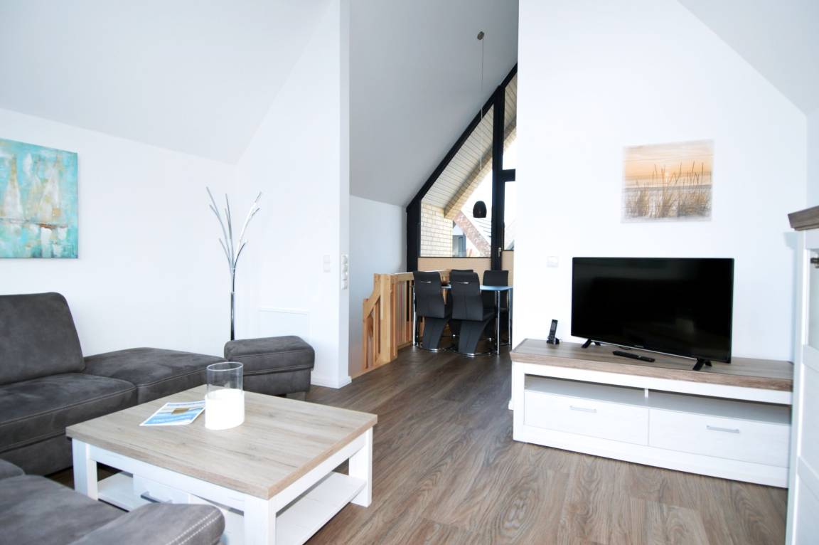 Das Badezimmer mit ebenerdiger Dusche, Waschbecken und WC ist bequem von den Schlafzimmern aus erreichbar und bietet die Möglichkeit, sich nach einem erlebnisreichen Tag zu erfrischen. Über eine Treppe gelangt man ins Dachgeschoss, wo der gemütliche Wohnbereich mit einer offenen, voll ausgestatteten Küche mit Spülmaschine und einem direkt anschließenden Essbereich zu finden ist. Auch im Urlaub muss hier auf Wohnkomfort nicht verzichtet werden. Vom Balkon mit Ostausrichtung aus kann man zudem eine traumhafte Urlaubszeit genießen.