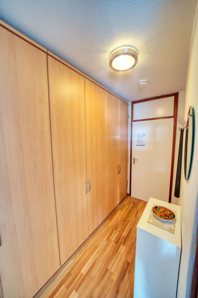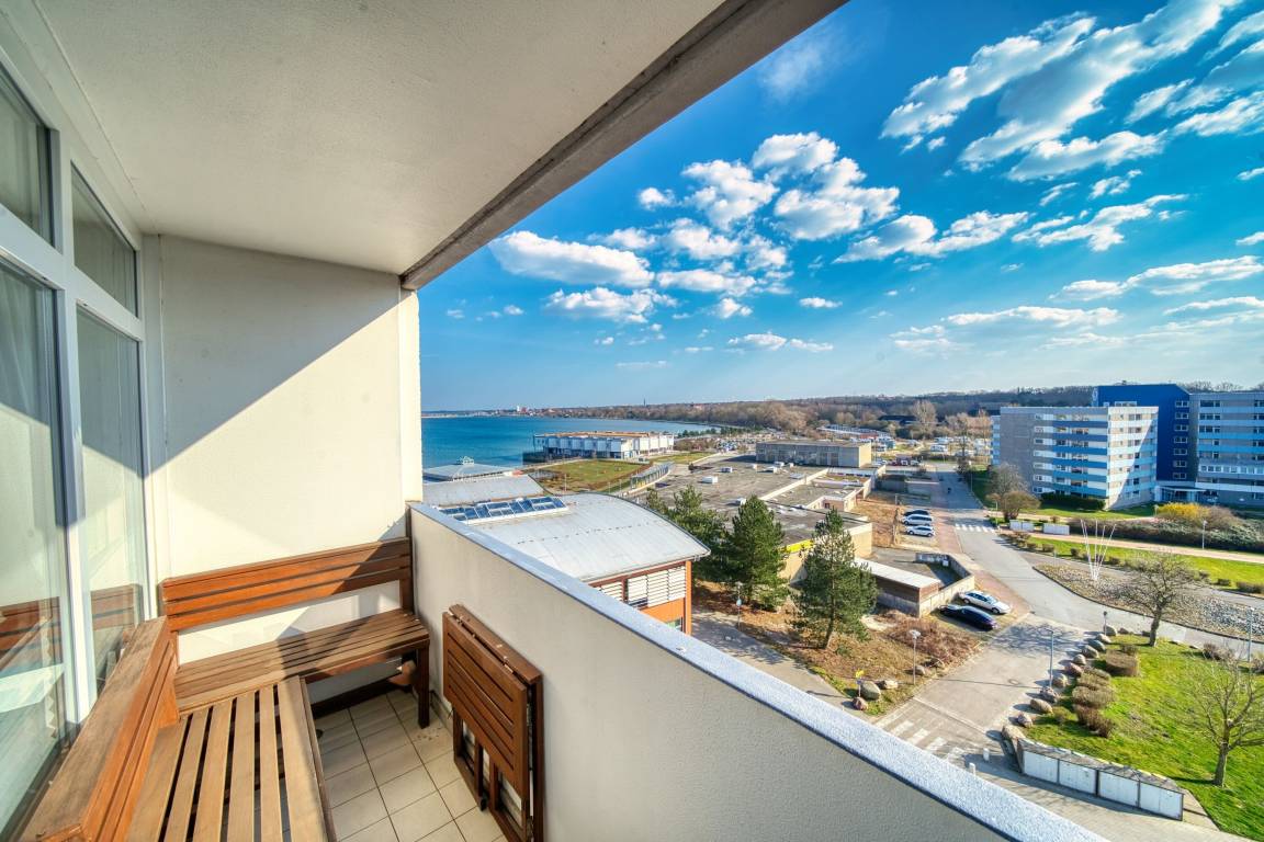 Diese stilvolle Wohnung liegt in der 7. Etage des Hauses A im Ferienpark Heiligenhafen. Der Südbalkon bietet Sonnenschein und einen seitlichen Blick auf den Binnensee. Auf 45 m² Wohnfläche finden bis zu 4 Personen bequem Platz – ideal für Familien oder Paare.