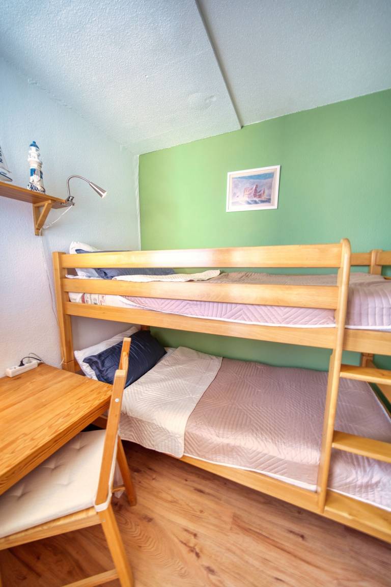 Der Wohn-/Essbereich ist mit Ledercouch, Essecke, Flachbild-TV und abtrennbarem Schlafbereich mit zwei Einzelbetten ausgestattet. Ein separates Kinderzimmer verfügt über ein Etagenbett. Die Küche ist komplett ausgestattet mit Geschirrspüler, Mikrowelle, Kühlschrank mit Gefrierfach, Kaffeemaschine, Wasserkocher und Kochutensilien. Das Bad bietet Dusche und WC. WLAN ist inklusive.