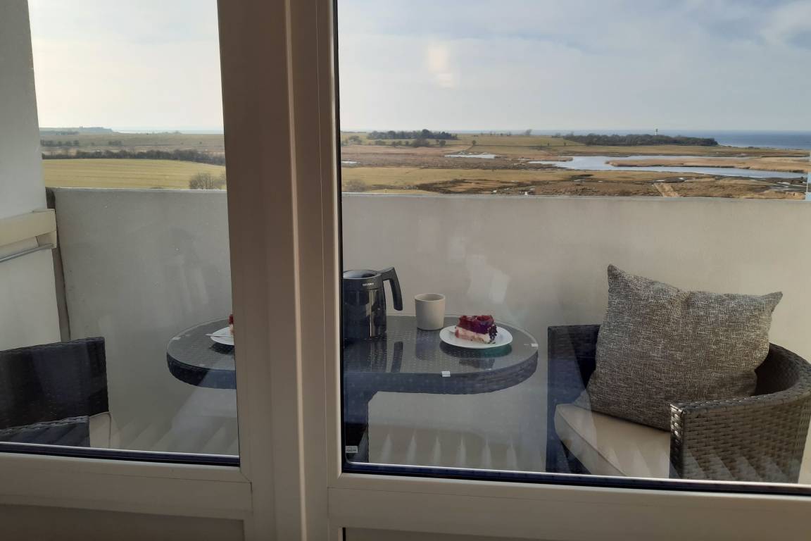 Von hier aus genießen Sie einen beeindruckenden Blick über die Salzwiesen des Eichholzes bis hin zur Ostsee. Besonders in den Abendstunden sorgt die tief stehende Sonne für eine stimmungsvolle Atmosphäre, die Sie entspannt vom möblierten Balkon aus erleben können. Hier lässt sich der Tag wunderbar ausklingen – mit Blick in die Natur und frischer Seeluft.