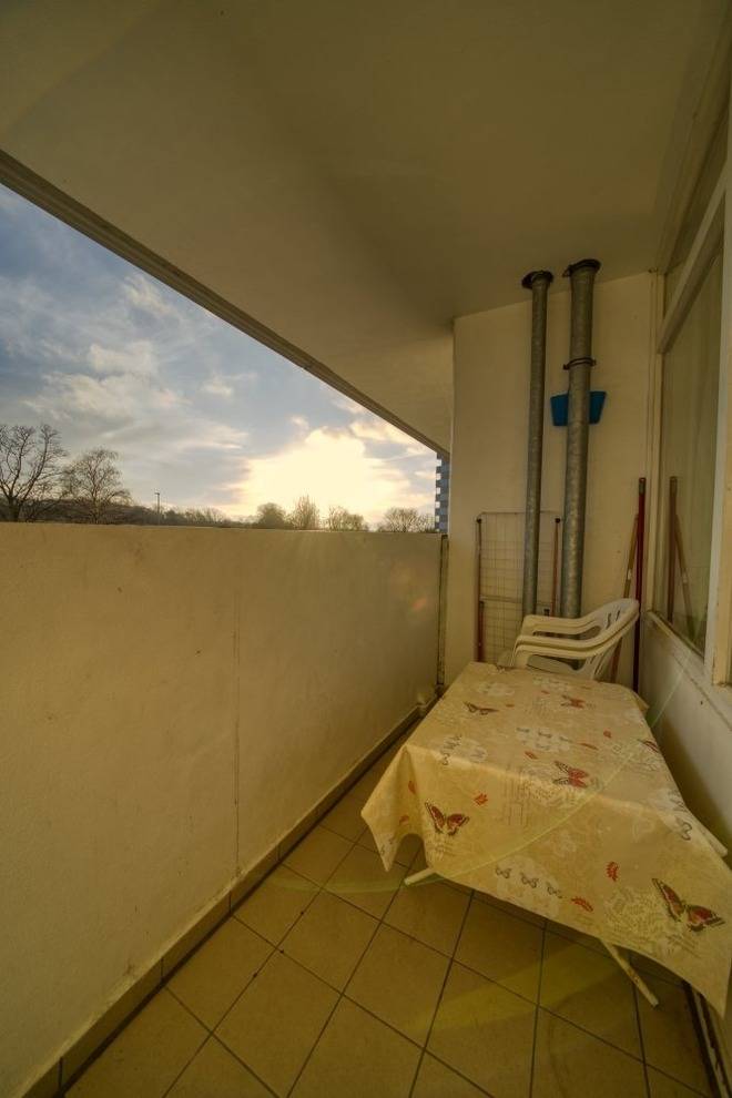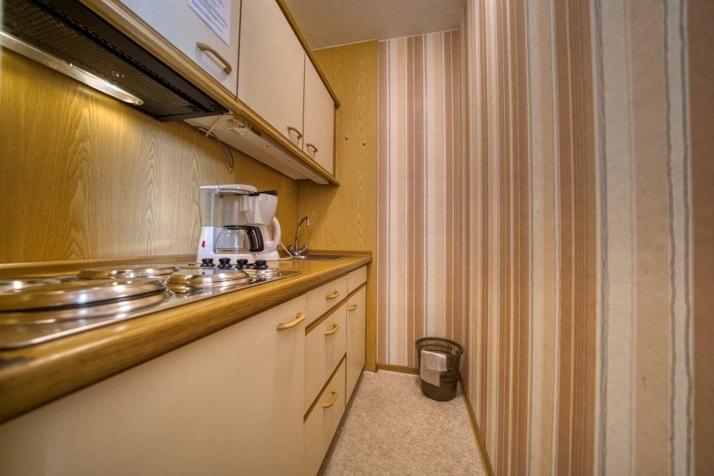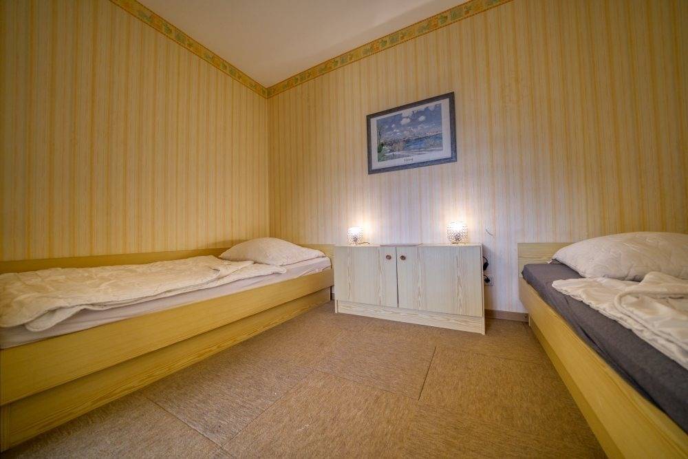 Die Wohnung im Haus O, 1. Etage, verfügt über einen Balkon zur Nordseite mit Blick in den Innenhof. Das Wohn-Esszimmer ist mit Schlafcouch und Fernseher ausgestattet. Der Elternschlafbereich bietet ein Doppelschrankbett, zusätzlich gibt es ein separates Kinderzimmer mit Einzelbett. Die Küche ist komplett eingerichtet mit Kühlschrank, 4-Plattenherd und Geschirrspüler. Das Bad verfügt über WC und Dusche; eine Loggia ist ebenfalls vorhanden.