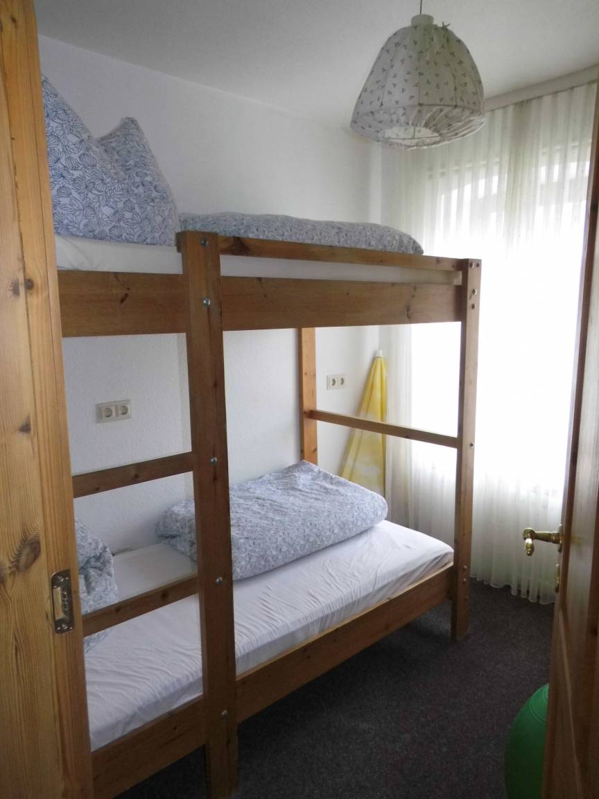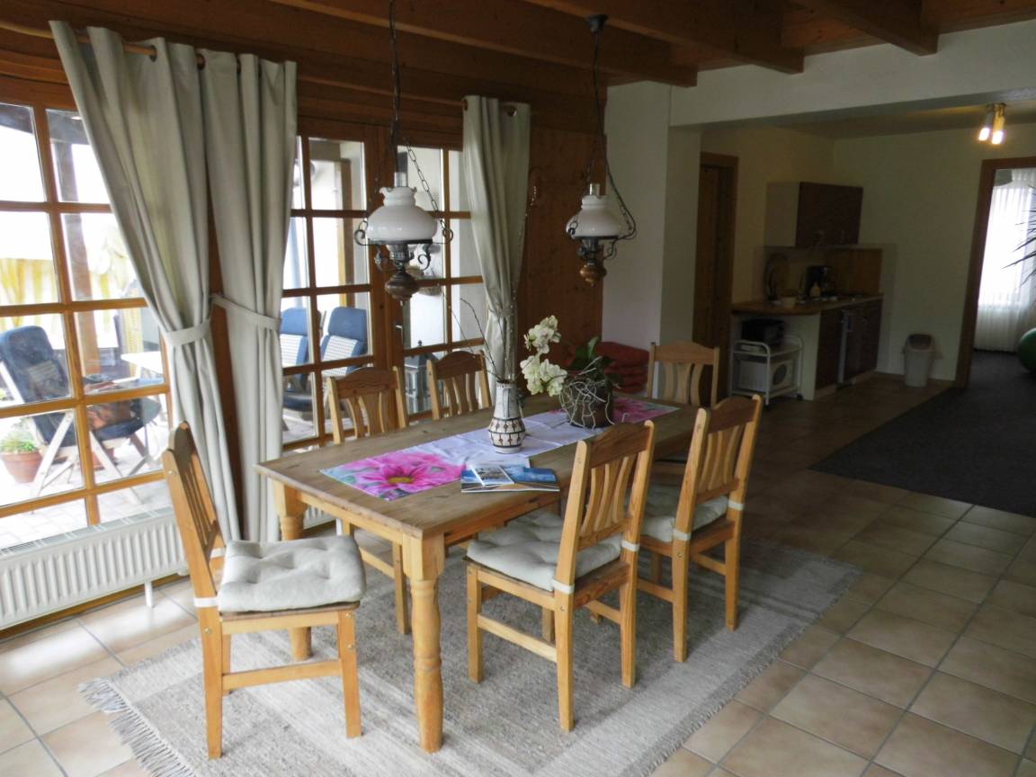 Großzügige Erdgeschoß- Ferienwohnung mit Kamin.Ca. 80 qm. Wohnzimmer mit Couchgarnitur, TV, separate Essecke. 1 Schlafzimmer mit Doppelbett; Kinderzimmer mit Etagenbett Etagenbett 0,9 * 2 m. Pantry- Küche komplett ausgestattet,2-Platten Herd , Mikrowelle, Gefriermöglichkeit vorhanden, Waschmaschine/Trockner im Gemeinschaftsraum. Bad mit Dusche/WC.