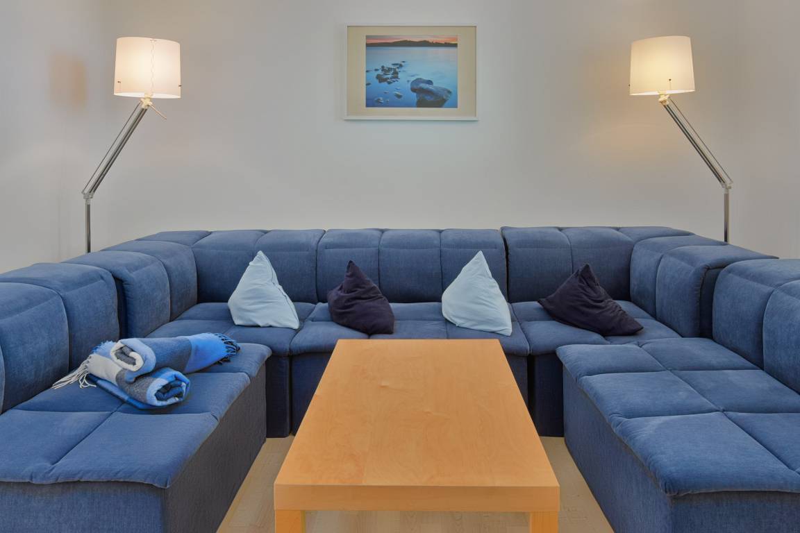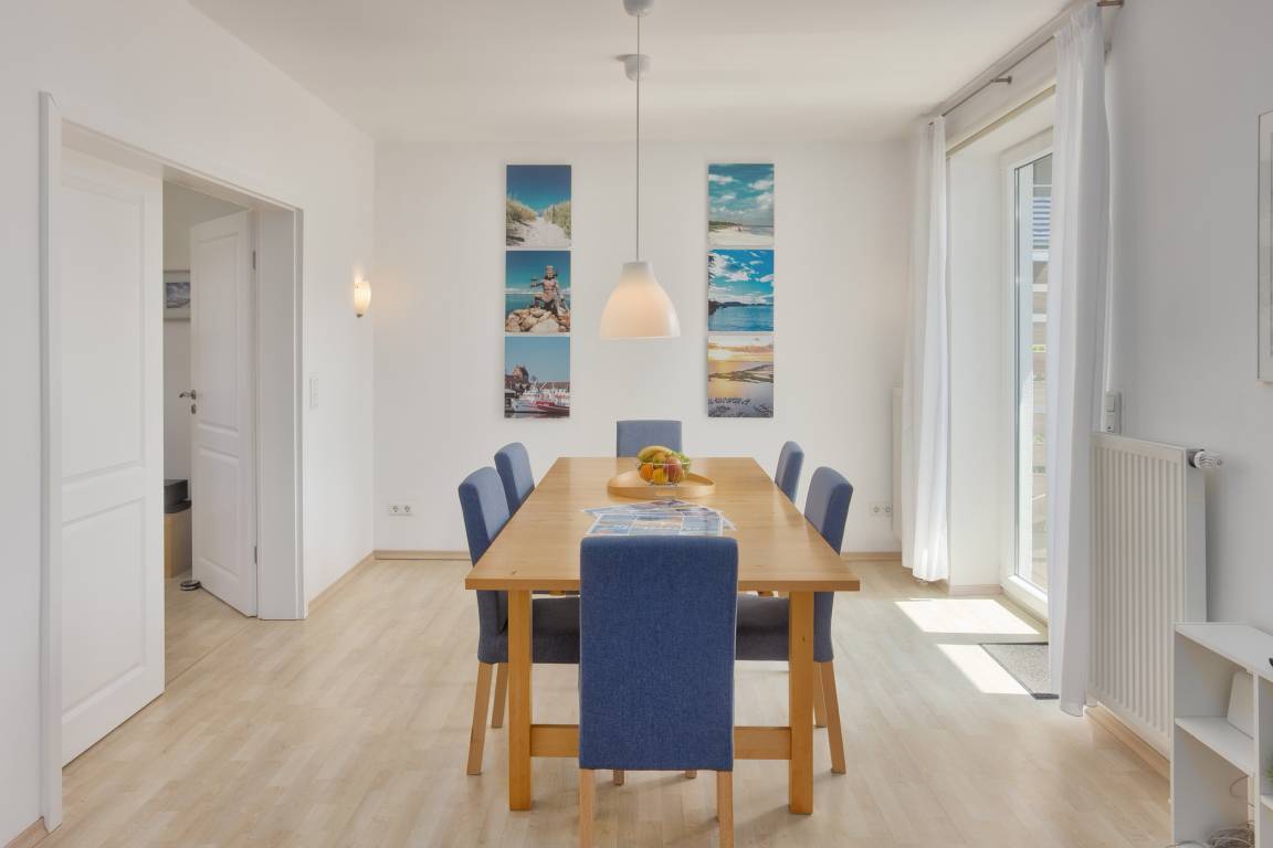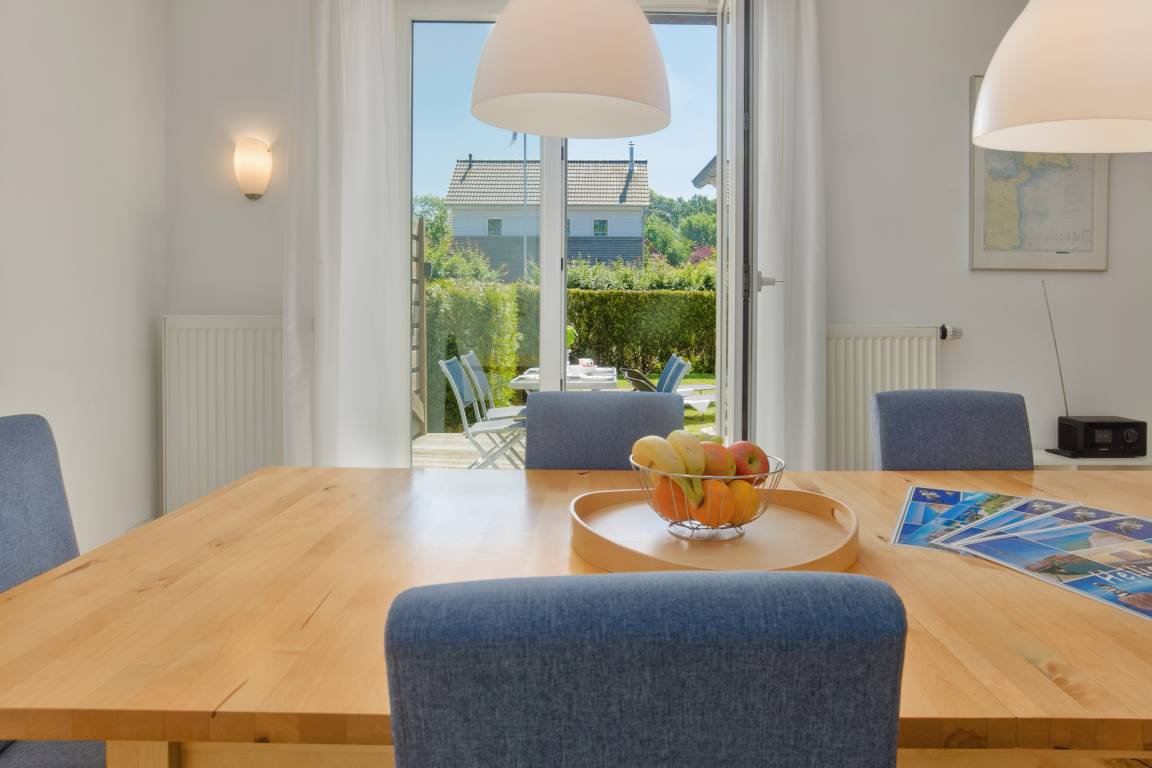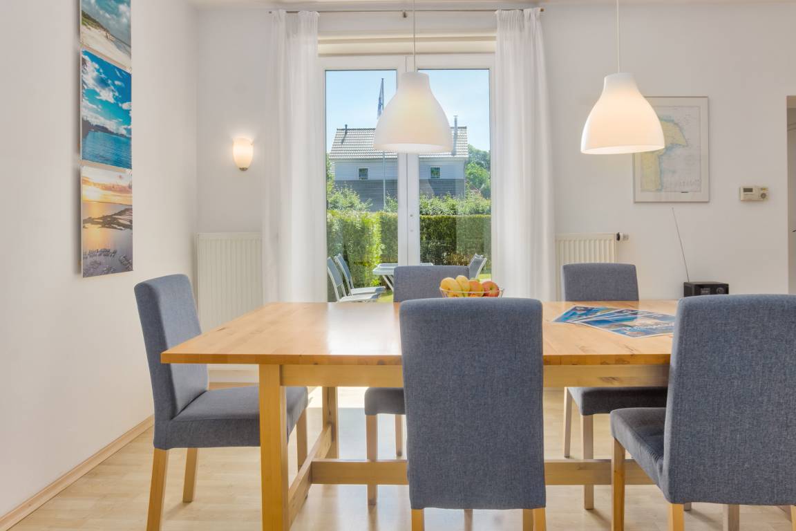 Im Erdgeschoss erwartet Sie der großzügige Wohn- und Essbereich, der als Mittelpunkt des Hauses dient. Eine gemütliche Couchgarnitur lädt zum Entspannen ein, während der Smart-TV für Unterhaltung sorgt. Der große Essplatz bietet ausreichend Raum für gemeinsame Mahlzeiten und gesellige Stunden. Die Küche ist praktisch integriert und ermöglicht eine unkomplizierte Selbstversorgung während Ihres Aufenthaltes.
