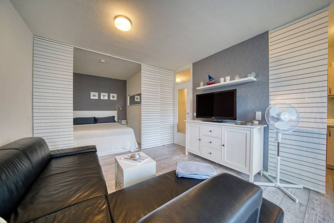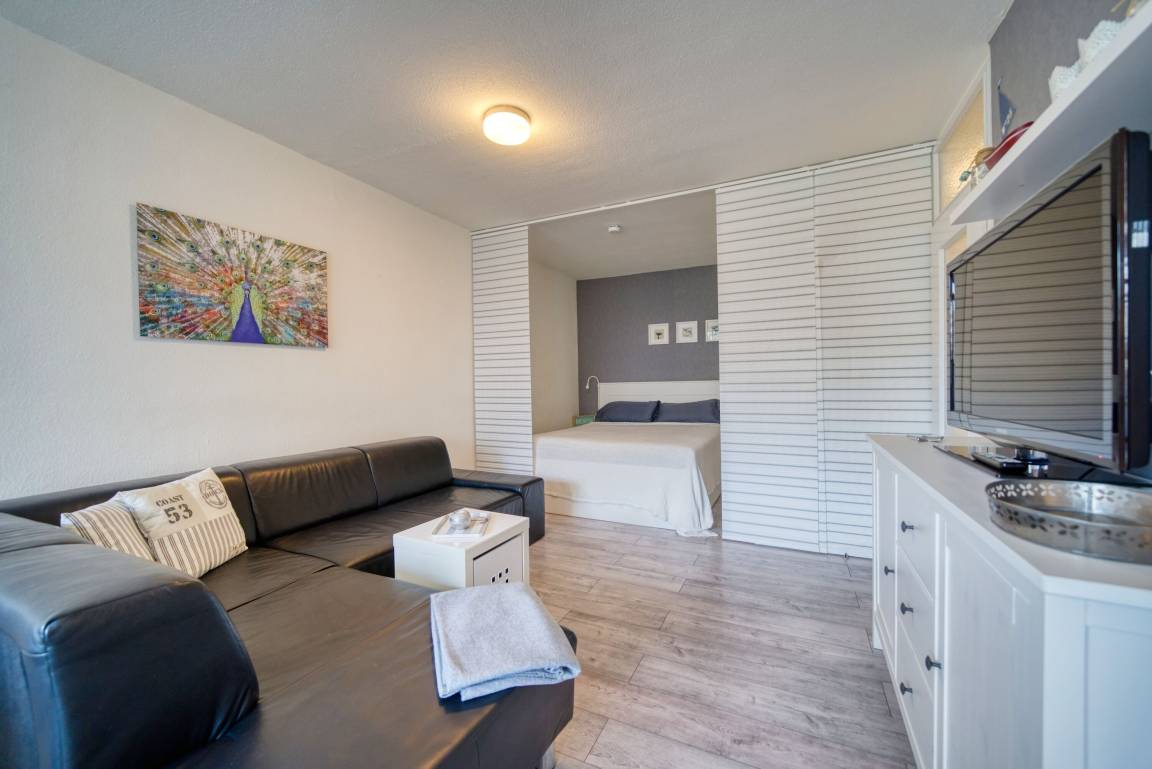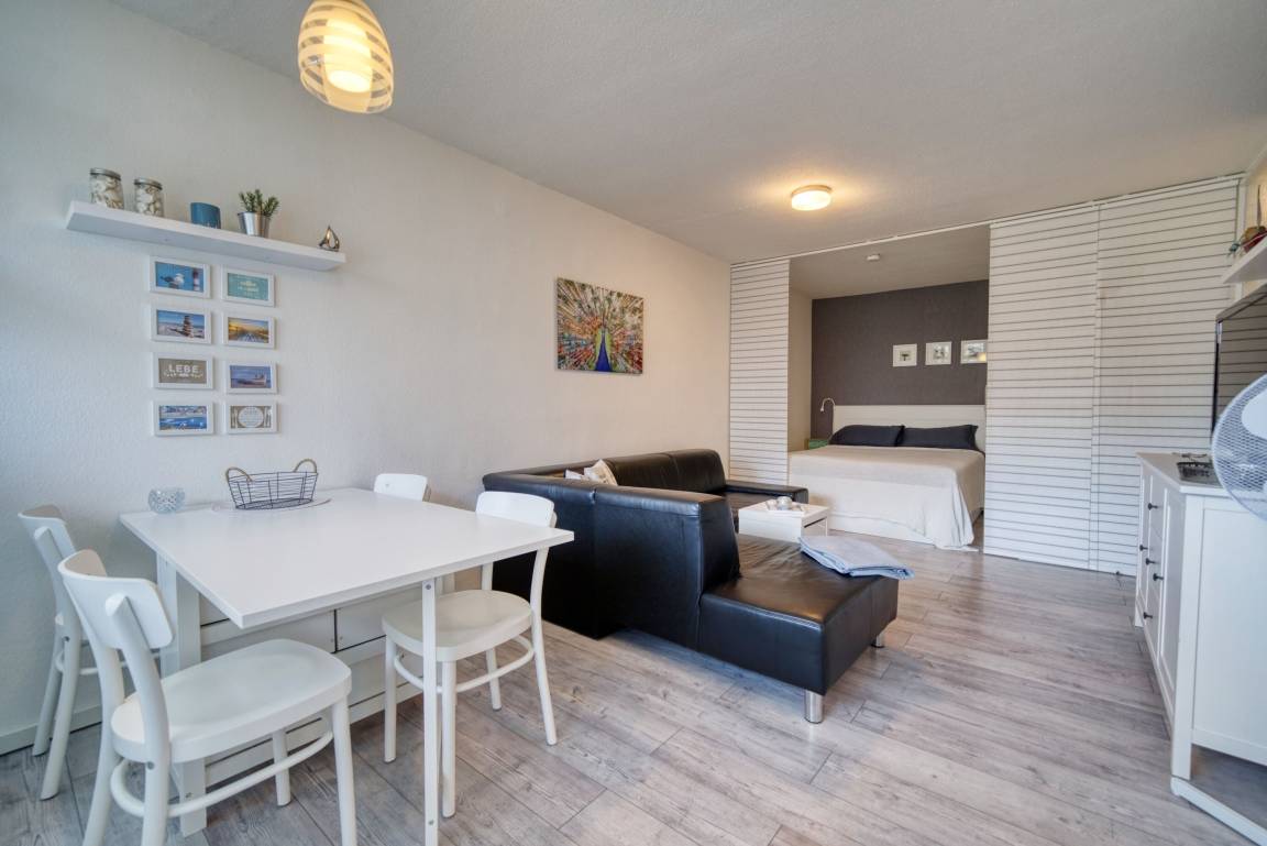 Wohn-Schlafzimmer mit Doppelbett (160x200 cm), Ecksofa, Esstisch vor dem Balkon und Smart-TV