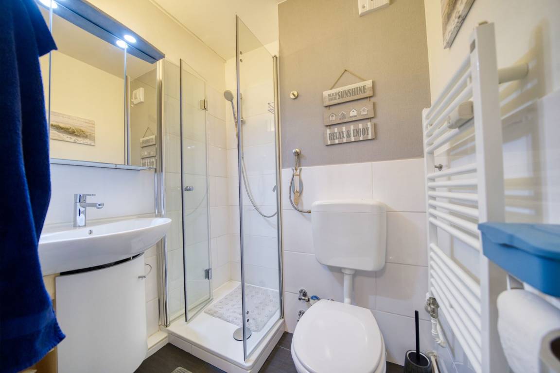 Badezimmer mit Duschkabine mit niedrigem Einstieg, WC und Handtuchtrockner