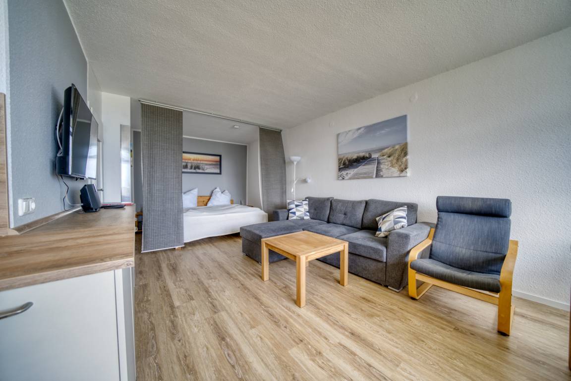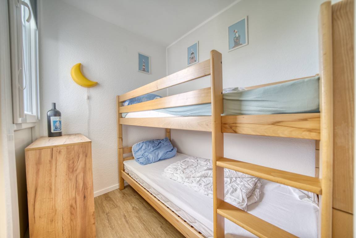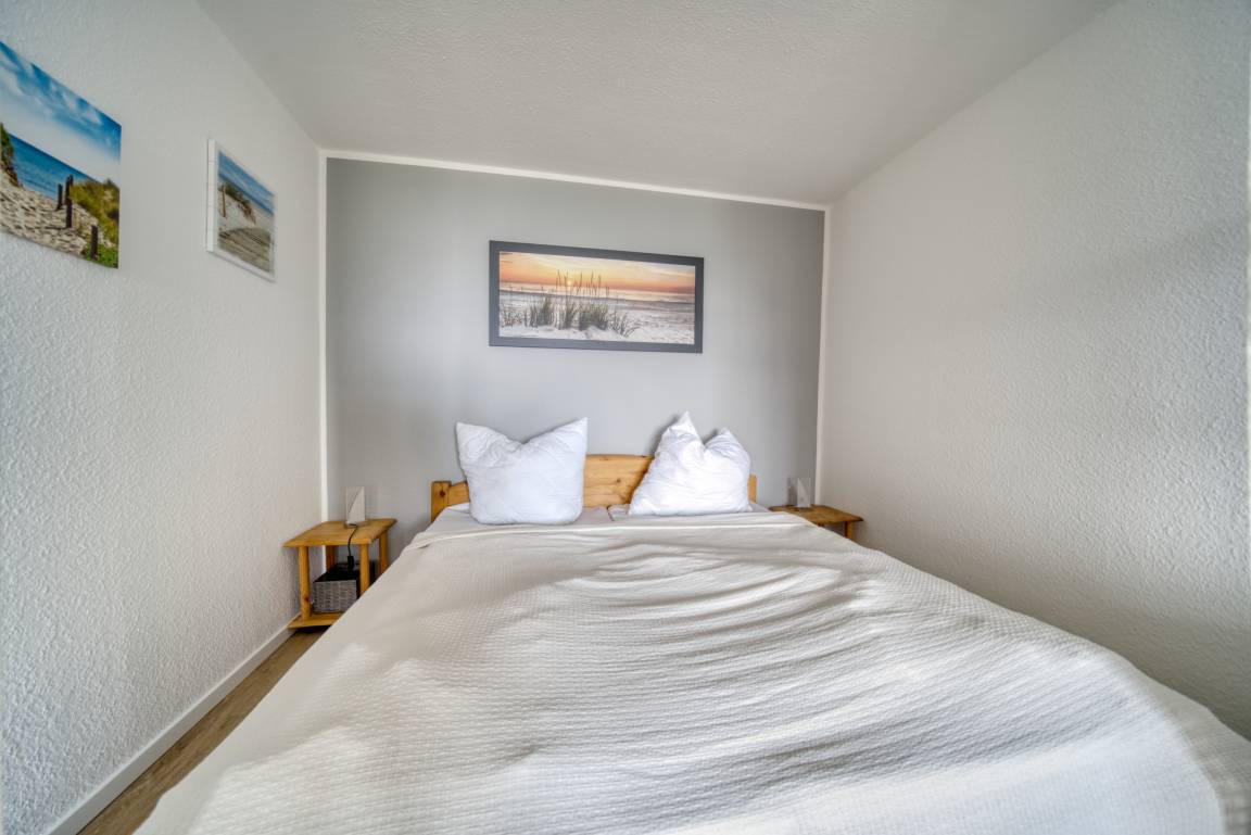 Die Wohnung verfügt über Wohn-/Essbereich mit Smart-TV, Schlafbereich mit Doppelbett, Kinderzimmer mit Etagenbett, Bad mit WC, Duschkabine und Handtuchtrockner sowie voll ausgestattete Küche mit Cerankochfeld, Backofen, Mikrowelle, Kühlschrank mit Gefrierfach und Spülmaschine. Kostenloses WLAN, Fahrstuhl, kostenloser Parkplatz, abschließbare Fahrradräume, nur ca. 300 m zum Strand. Nichtraucherwohnung, keine Haustiere. Aktiv-Hus, Restaurants und Einkaufsmöglichkeiten nur 30 m entfernt.