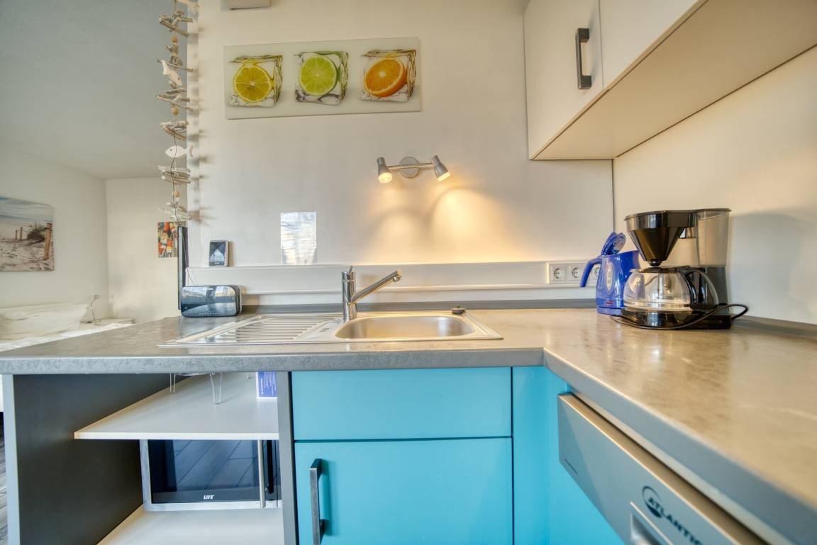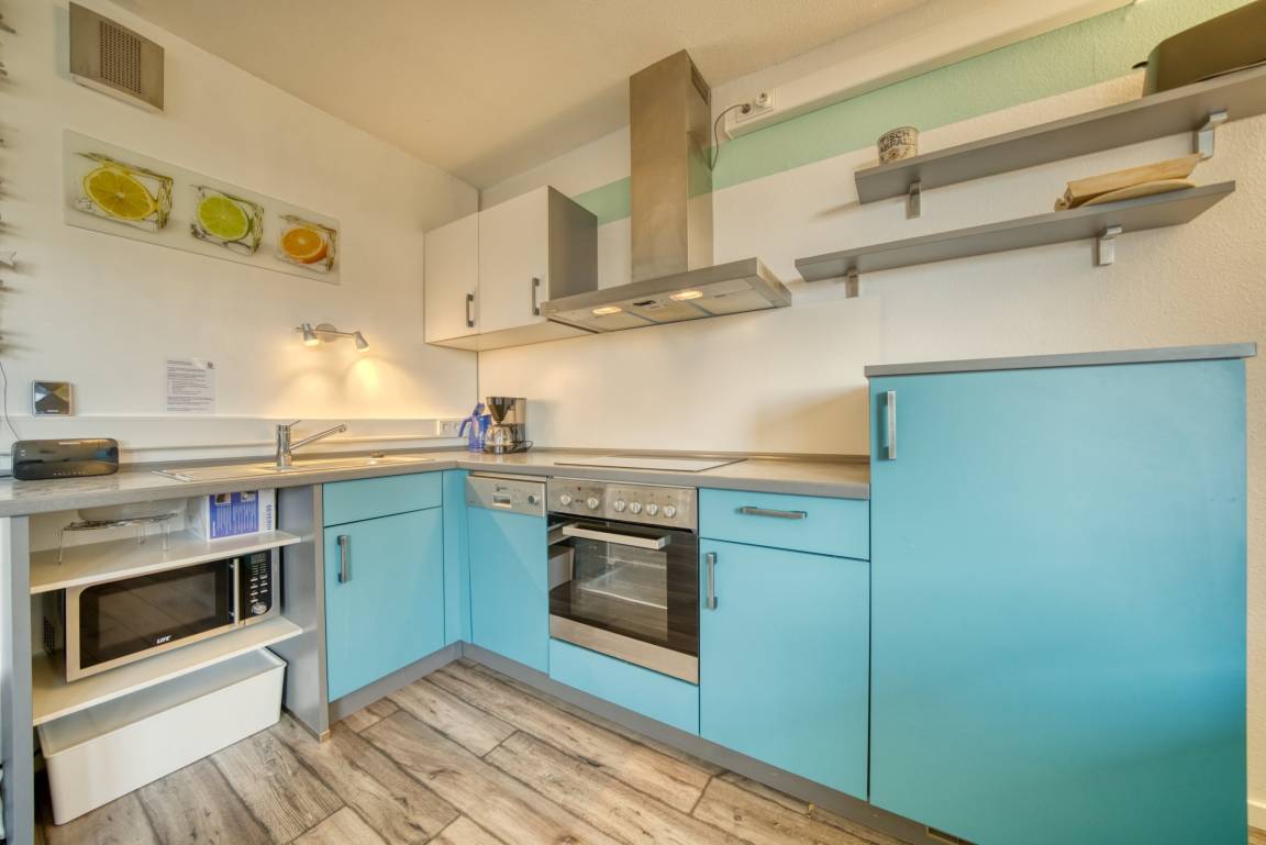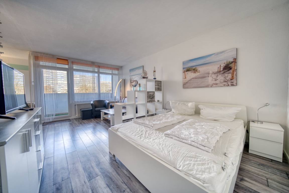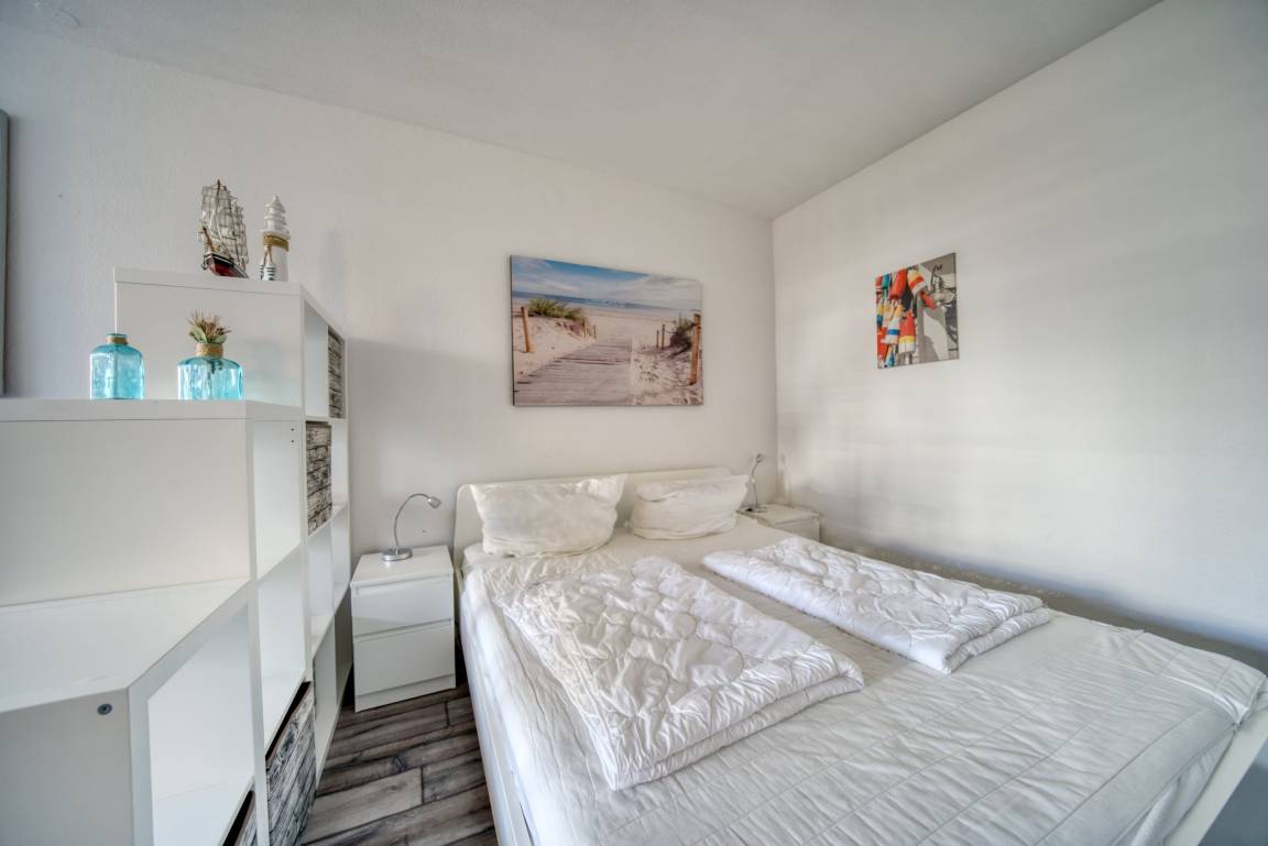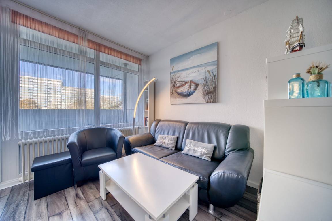 Wohn-Schlafraum mit Doppelbett für 1–2 Personen, Wohn-/Esszimmer mit Sofa, Flachbild-TV und Radio, abgetrennter Schlafbereich. Komplett ausgestattete Küche mit Kühlschrank, Gefrierfach, Backofen, Cerankochfeld, Geschirrspüler, Kaffeemaschine, Wasserkocher, Toaster und Geschirr. Bad mit WC, Dusche und Waschbecken. Laminatboden, Allergikerfreundlich. Balkon mit Blick auf den Innenhof. Nichtraucherwohnung, keine Haustiere, maximal 2 Personen. Kostenfreier PKW-Stellplatz, Fahrstuhl vorhanden, Strand ca. 300 m. Einkaufsmöglichkeiten, Restaurants, Bars, Spielplätze und Aktiv-Hus in der Nähe.