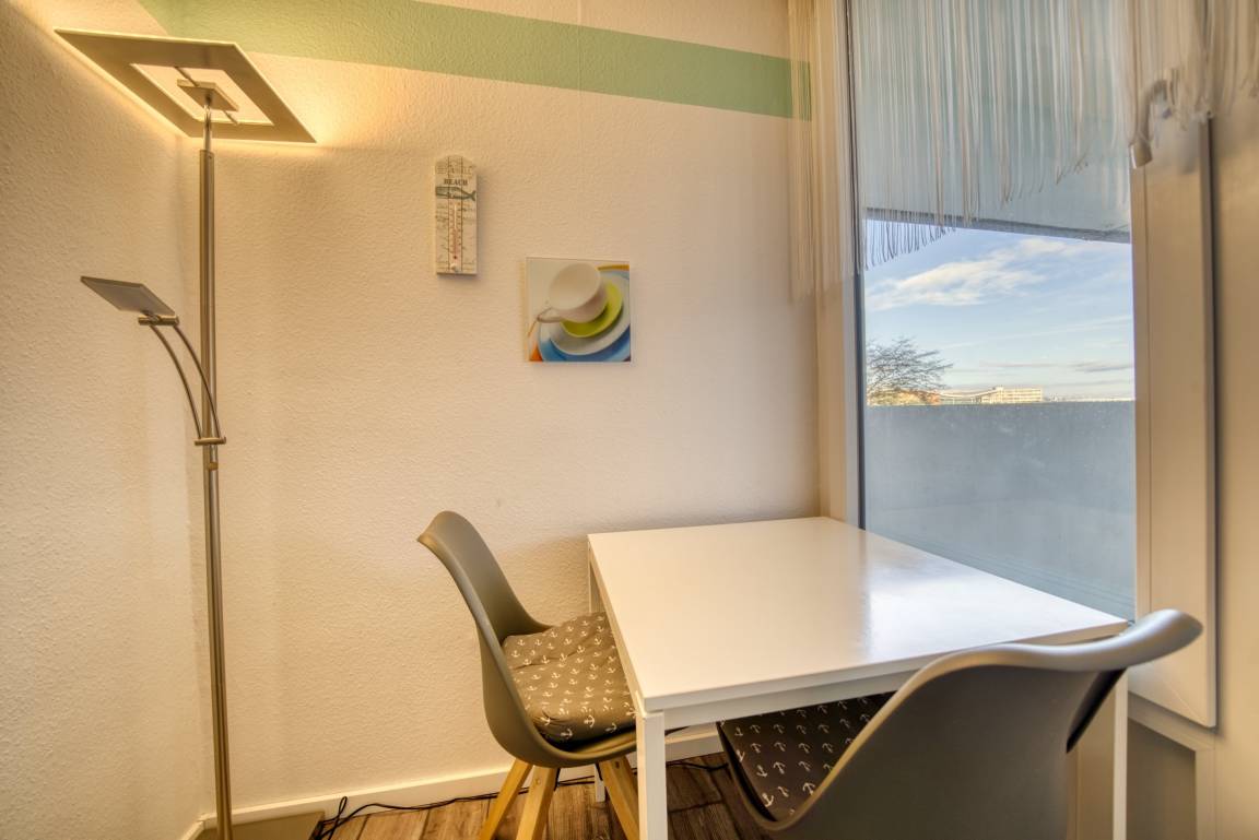 Unsere Ferienwohnung in Heiligenhafen eignet sich sehr gut für entspannte Tage oder einen tollen Urlaub an der Ostsee. Die 38 qm große, frisch renovierte Wohnung bietet Platz für 1–2 Erwachsene. Sie befindet sich im Haus N des Ferienparks und liegt im 1. Geschoss mit Balkon zum Innenhof, der einen schönen Blick auf die Grünanlagen bietet.