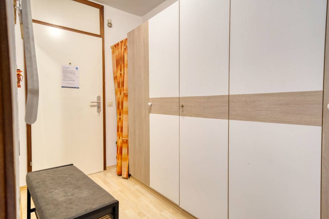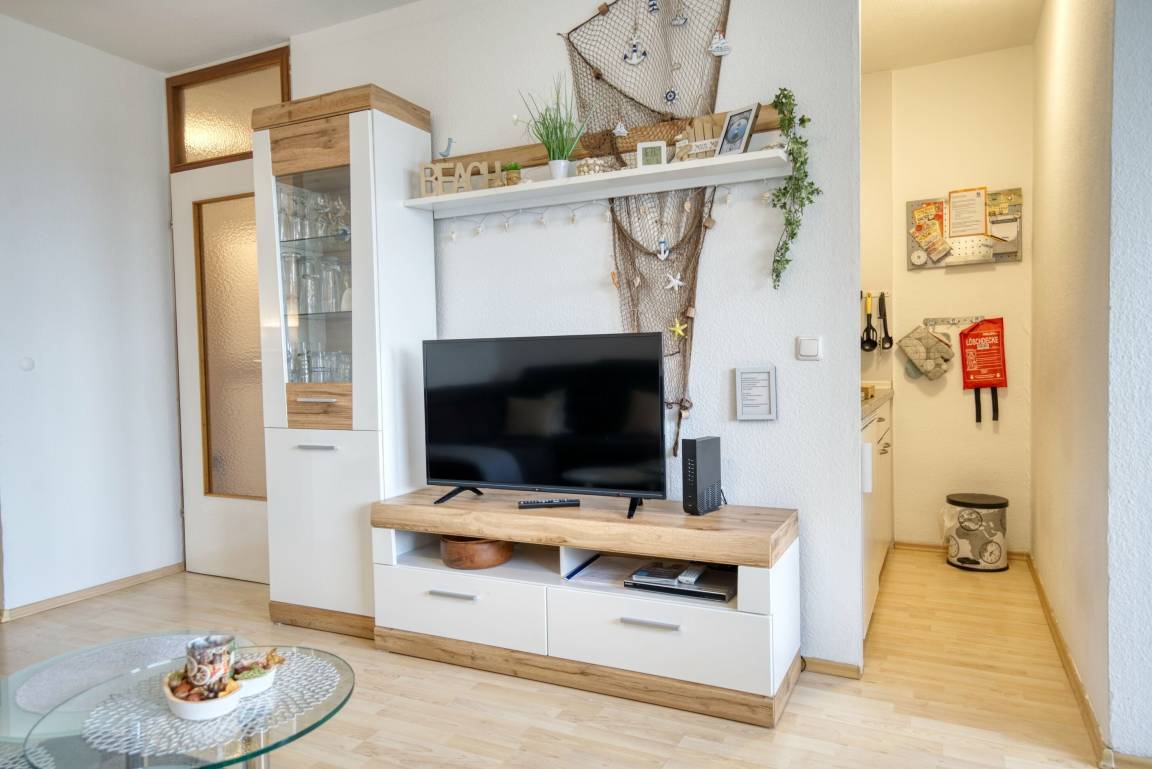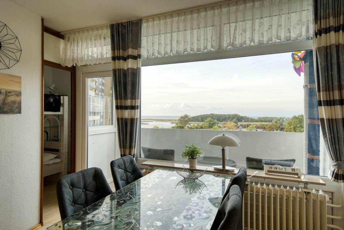 Die Wohnung liegt im Haus I Ferienpark, in der 4. Etage, mit Balkon zur Westseite, der einen herrlichen Ostseeblick sowie Sonne vom Nachmittag bis in die Abendstunden bietet. Wohnfläche 45 m², Elternschlafbereich mit Doppelbett (abgetrennt durch Vorhang), Wohn-/Essbereich mit TV, Kinderzimmer mit Etagenbett. Küche mit Mikrowelle, Kühlschrank und 4-Plattenherd. Bad mit WC und Duschkabine. Balkon mit Westausrichtung. Bonus: Highspeed-WLAN, Kindersitzmodul, klappbarer Gepäcktransporter. Für max. 4 Personen, Nichtraucherwohnung, keine Haustiere. Strand ca. 300 m, Aktiv-Hus, Shops und Freizeitmöglichkeiten direkt im Ferienpark.