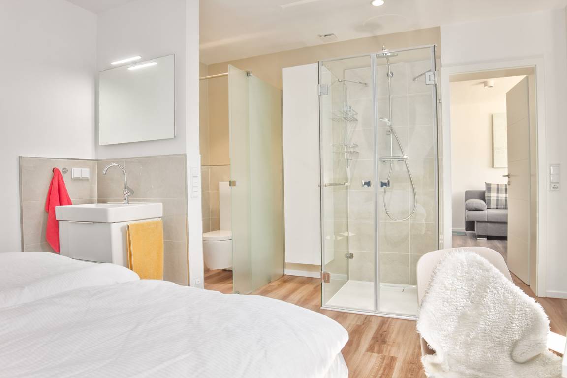 Die vollverglaste, ebenerdige Dusche sowie das Waschbecken befinden sich im Schlafzimmerbereich. Der kleine WC-Bereich mit Geberit-WC und Handwaschbecken ist privatissime vom Schlafbereich durch eine Schiebetüranlage mit Sandstrahlglas abgetrennt.