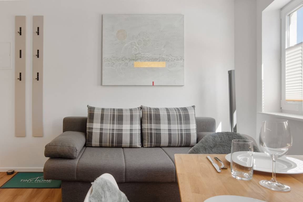 Tiny [klein] Home [zu Hause] bedeutet, was diese Ferienwohnung vermitteln möchte: Sie ist „vom Papier her" klein, aber Sie fühlen sich sofort wohl. Sie erfahren, dass glücklich sein nicht abhängig ist von Quadratmetern. Sich angekommen fühlen, daheim sein, das ist der Anspruch dieser Wohnung mit ihrer außergewöhnlichen Raumnutzung.