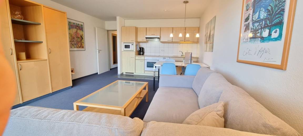 Das separate Schlafzimmer ist mit einem komfortablen Doppelbett und einem geräumigen Kleiderschrank ausgestattet. Der Wohnbereich bietet ein bequemes Schlafsofa, ideal für eine dritte Person oder zum Entspannen nach einem Tag voller Erlebnisse. Der kombinierte Wohn- und Essbereich mit Küchenzeile ist funktional eingerichtet und umfasst Kochgelegenheit, Kühlschrank, Kaffeemaschine und Wasserkocher – perfekt für eine unkomplizierte Selbstversorgung. Ein moderner Flachbild-TV sorgt für Unterhaltung.