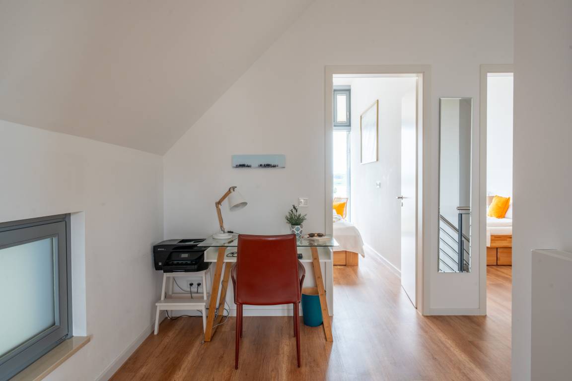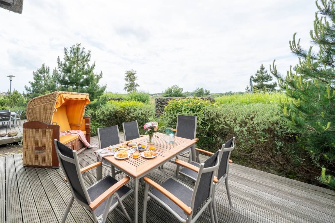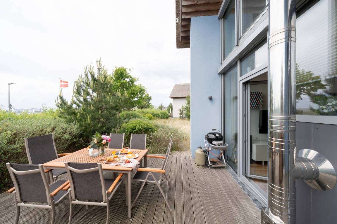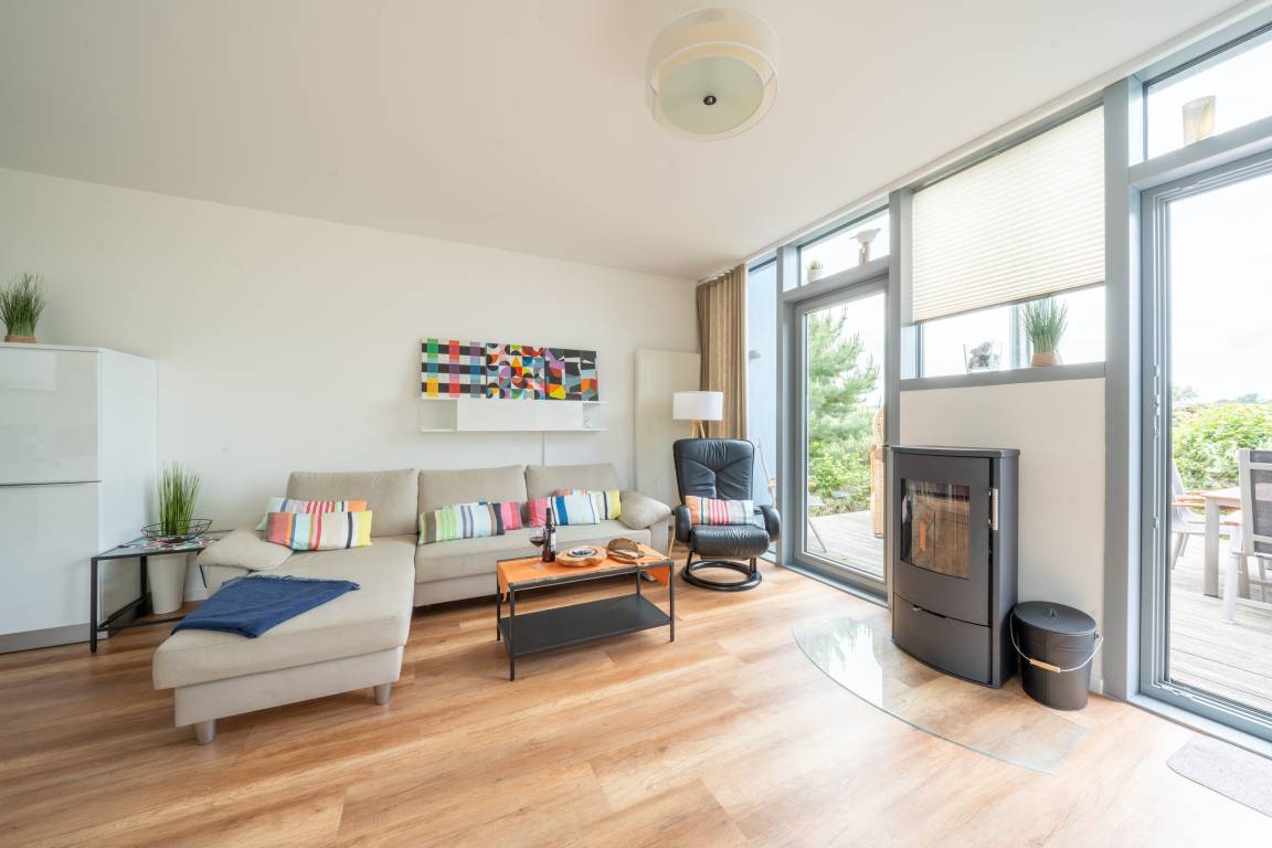 Ob die Sonne durch die voll verglaste Westseite scheint oder der Wind die Wolken über den Himmel pustet, der herrlich weite Blick über den Südstrand und den Binnensee versetzt jeden sofort in Urlaubsstimmung.