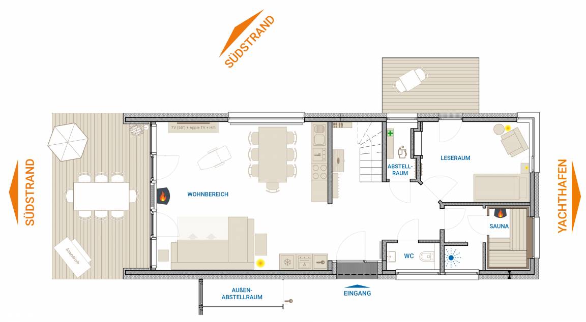 Das moderne 5-Sterne SÜDSTRANDHUS liegt in direkter Nähe zur Ostsee sowie zum Naturschutzgebiet Graswarder mit seinen weiten Salzwiesen. Schon von den bodentiefen Panoramafenstern im Wohnzimmer aus können Sie entspannt den Blick über den Binnensee schweifen lassen. Der großzügige Wohn- und Essbereich lädt zum Verweilen vor dem Kamin ein. Daneben gibt es im Erdgeschoss ein ruhiges Lesezimmer und ein WC. Ein weiteres Highlight des Hauses ist die Sauna nebst Regendusche. Im Obergeschoss befindet sich neben den drei Schlafzimmern mit Marina- bzw. Binnenseeblick das moderne Bad mit Badewanne. Also auch bei Schietwetter können Sie mal so richtig die Seele baumeln lassen – mit einem Wellnesstag im eigenen Ferienhaus.