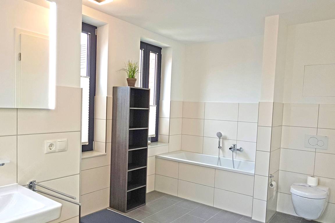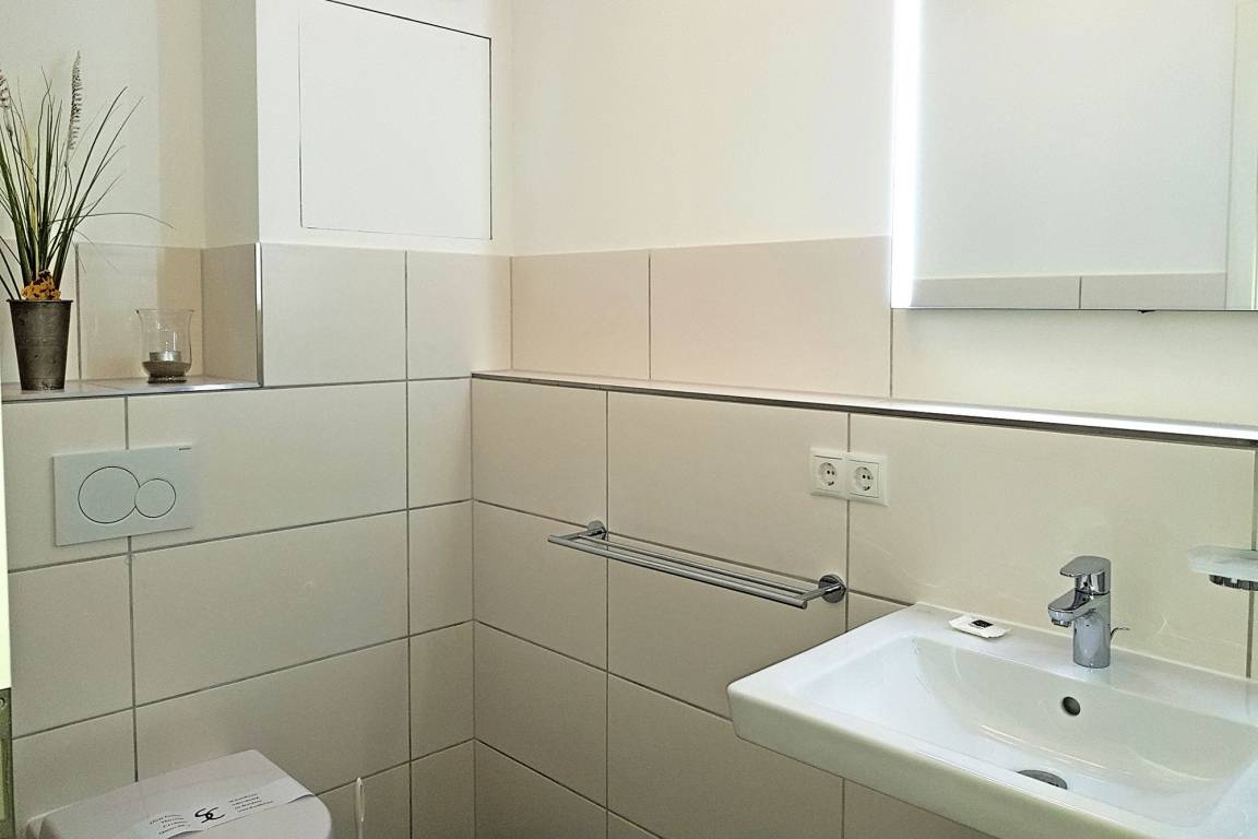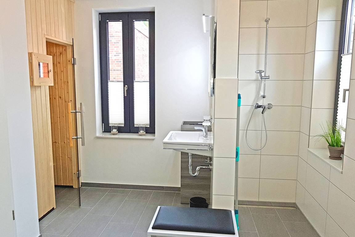 Die beiden Bäder auf den oberen Etagen sind jeweils mit einer Badewanne bzw. bodengleichen Duschen ausgestattet – ideal für eine erfrischende Dusche nach einem langen Tag am Meer. Wer nach einem aktiven Urlaubstag zusätzlich entspannen möchte, kann die buchbare Aufguss-Sauna (gegen Gebühr) nutzen. Handtuchwärmer und WC gehören zur gehobenen Ausstattung. Zusätzlich steht im Erdgeschoss ein Gäste-WC zur Verfügung.