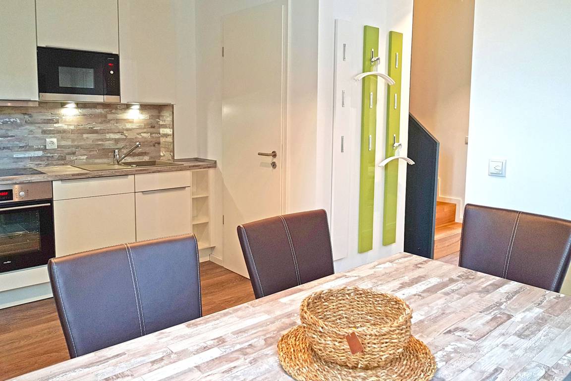 Die große, voll ausgestattete Küche mit angrenzendem Essbereich lässt keine Wünsche offen und ermöglicht es Ihnen, auch im Urlaub kulinarische Köstlichkeiten für Ihre Liebsten zuzubereiten. Direkt neben der Küche befindet sich ein kleiner Abstellraum mit Staubsauger sowie einer Waschmaschine-Trockner-Kombination.