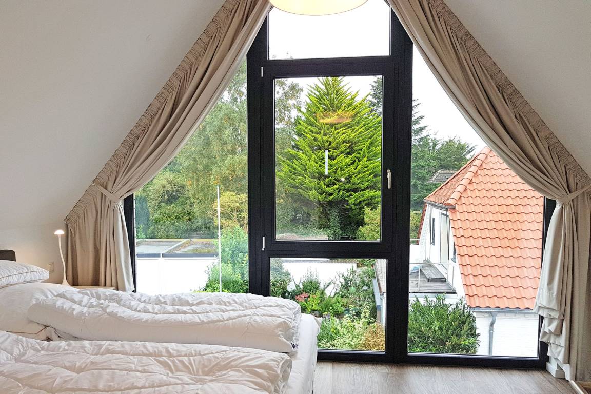 Drei komfortable Schlafzimmer bieten ausreichend Platz für Familien und kleine Gruppen. Im ersten Obergeschoss befindet sich ein Doppelboxspringbett mit eigenem TV, während das Dachgeschoss ein weiteres Doppelboxspringbett mit TV sowie zwei Einzelbetten beherbergt. Baby-Reisebett und Hochstuhl gehören zur Ausstattung, und gegen eine kleine Gebühr können Allergiker-geeignete Bettwäsche und Handtuchsets hinzugebucht werden. Vorhänge und Plissees sorgen für Verdunklung und eine erholsame Nachtruhe.