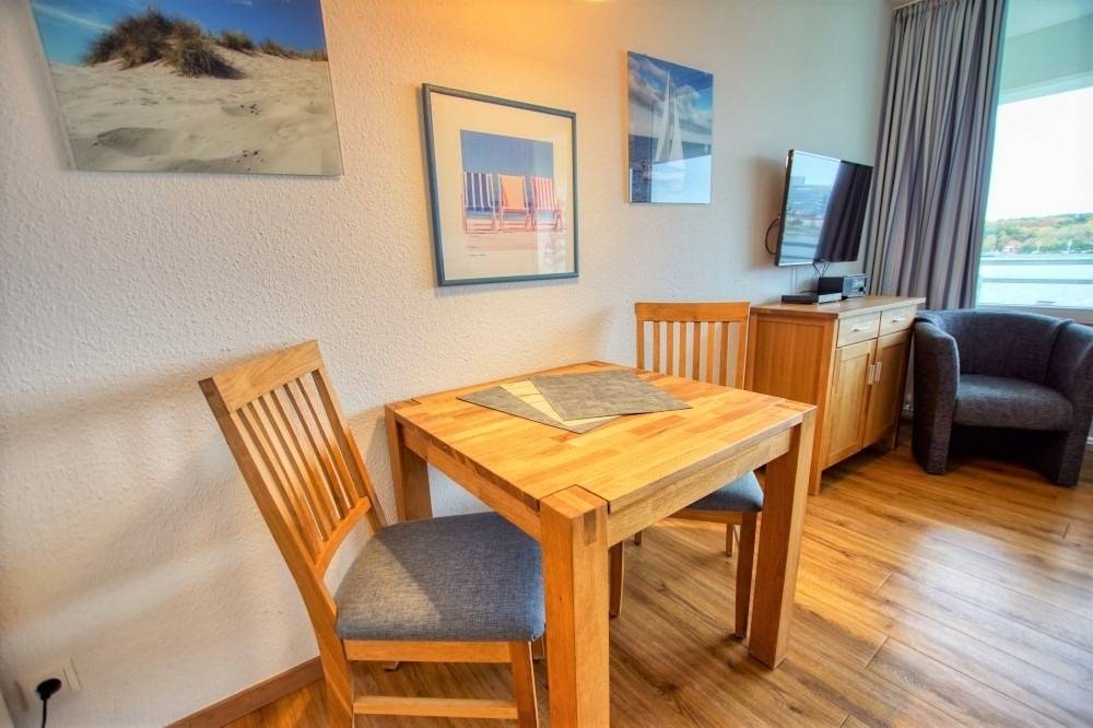 Die ca. 31 m² große Ferienwohnung im 2. Geschoss eignet sich für bis zu 2 Personen. Wohn-/Schlafbereich mit Doppelbett, ausziehbarer Couch, Flachbild-TV, Blu-ray-Player, Radio und Essecke mit Blick auf den Binnensee. Küche mit 2-Platten-Ceranherd, Kaffeemaschine, Wasserkocher, Mikrowelle und Kühlschrank mit Gefrierfach. Bad mit Dusche/WC. Südbalkon mit traumhaftem Seeblick, Vinylboden und Verdunkelungsmöglichkeiten. Kostenloses Internet vorhanden. Nichtraucherwohnung, keine Haustiere, Stellplatz nach Verfügbarkeit. Ideal für Paare oder Alleinreisende, die Ruhe, Strandnähe und Seeblick genießen möchten.
