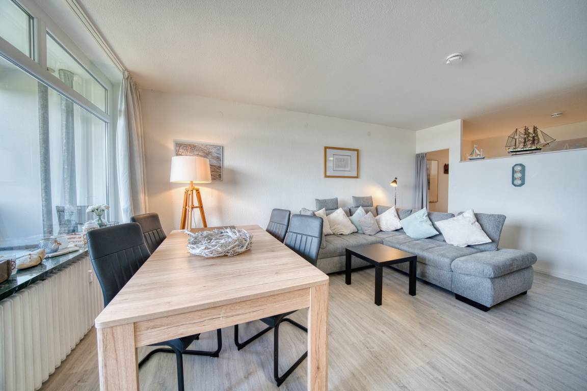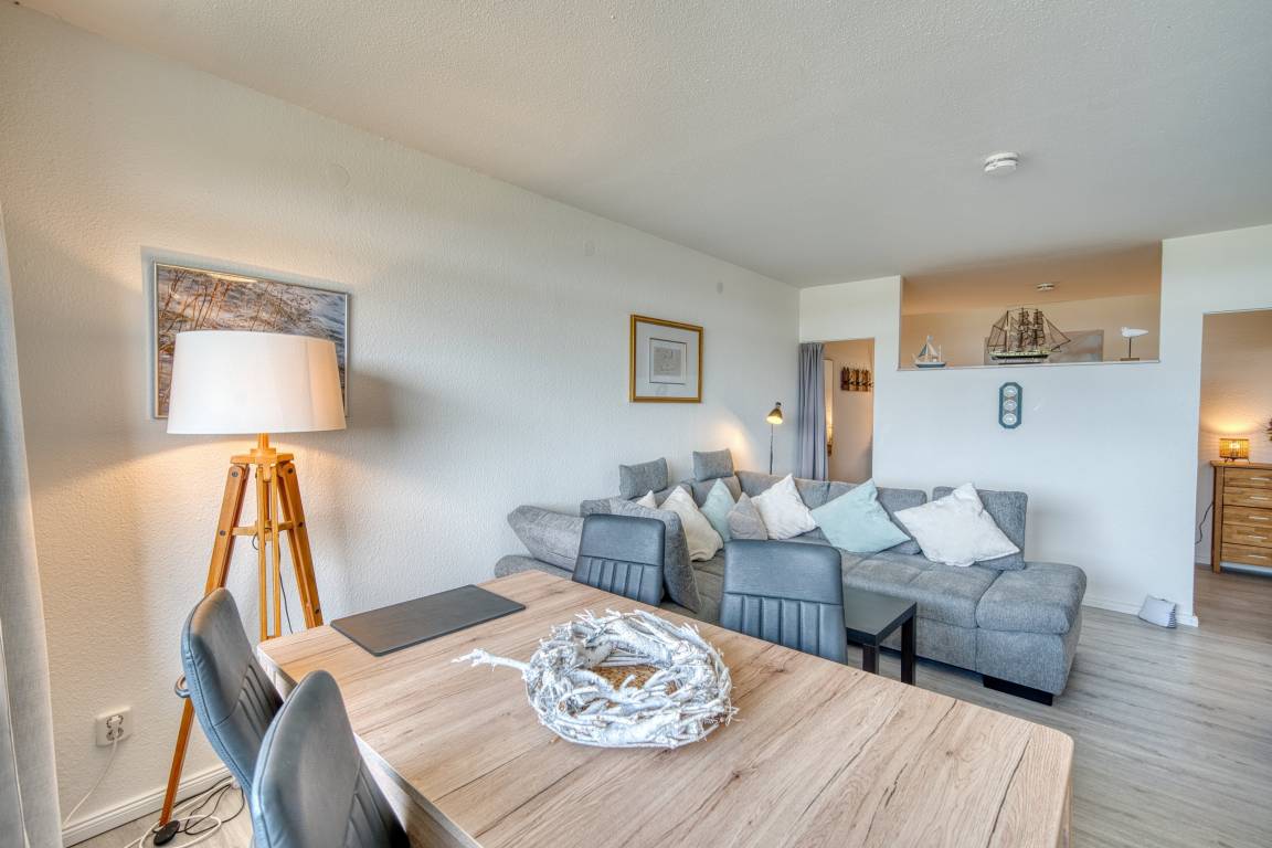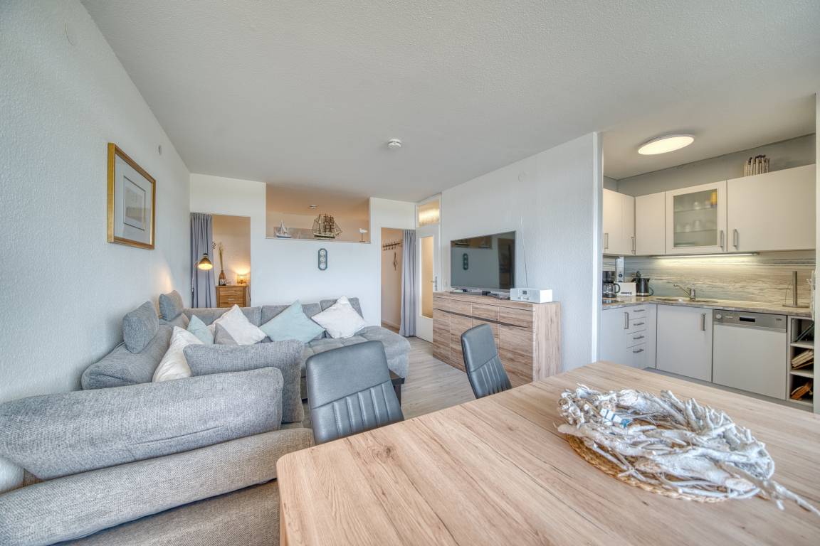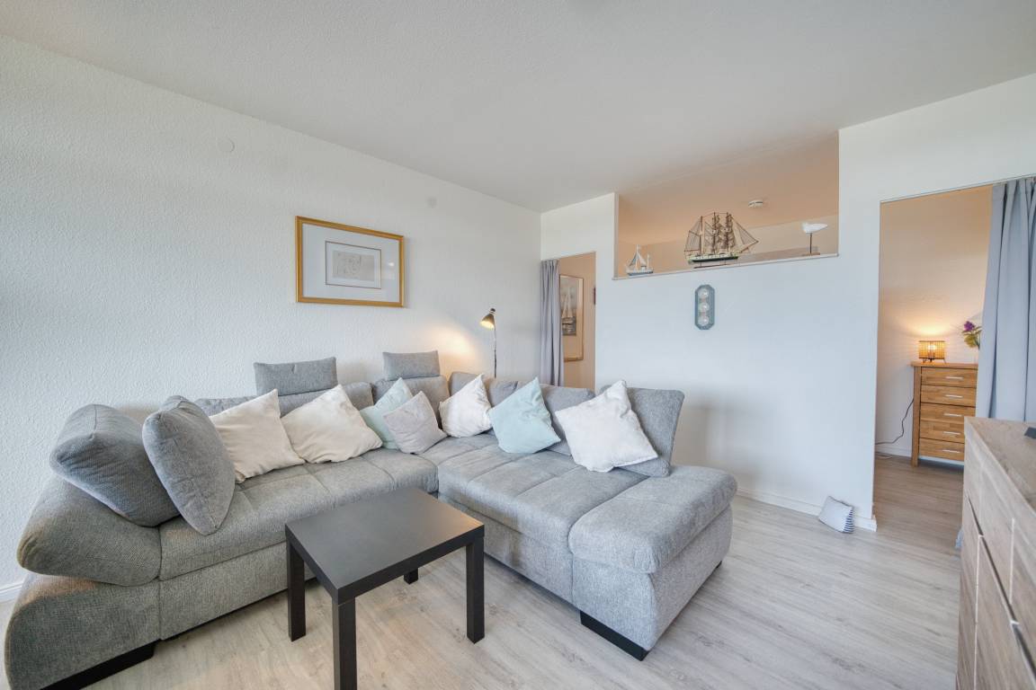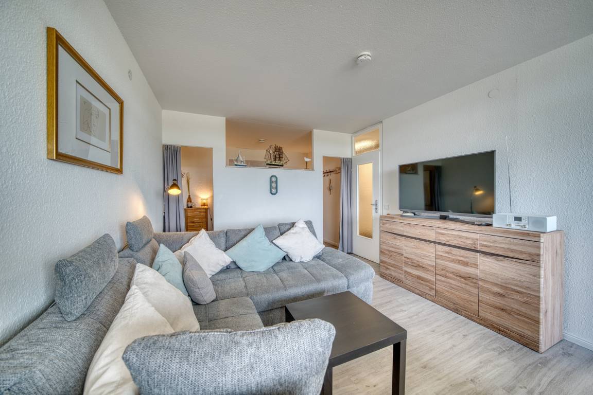 Wohn-/Esszimmer mit ausziehbarer Wohnlandschaft (140x200 cm) und 50"-Smart-TV, Elternschlafbereich mit Doppelbett (180x200), Kinderzimmer mit Einzelbett (90x190). Küche komplett ausgestattet (Kühlschrank mit Tiefkühlfach, Airfryer, Espressomaschine, Eierkocher, Handmixer, Smoothie-Maker, Kaffee-/Teeservice). Duschbad mit WC. Kostenloses WLAN. Nichtraucher, keine Haustiere, max. 4 Personen. Fahrstuhl, Fahrradräume, Strand ca. 300 m, Parkplatz vorhanden.