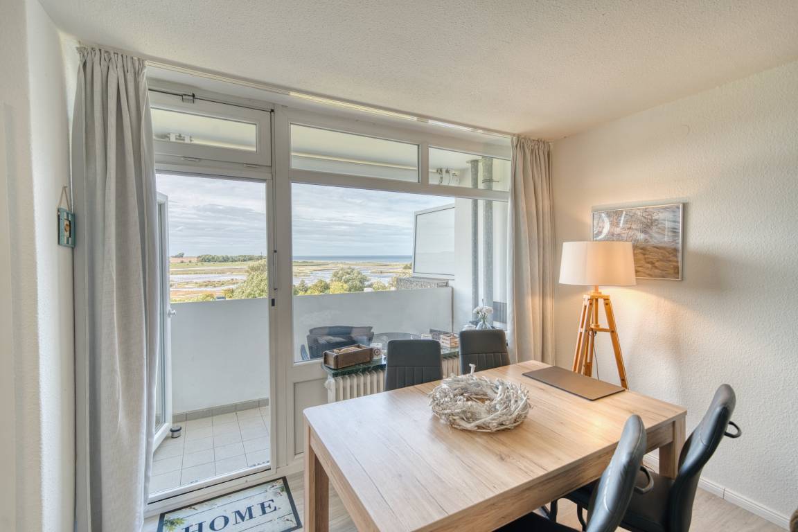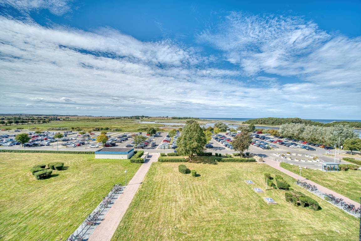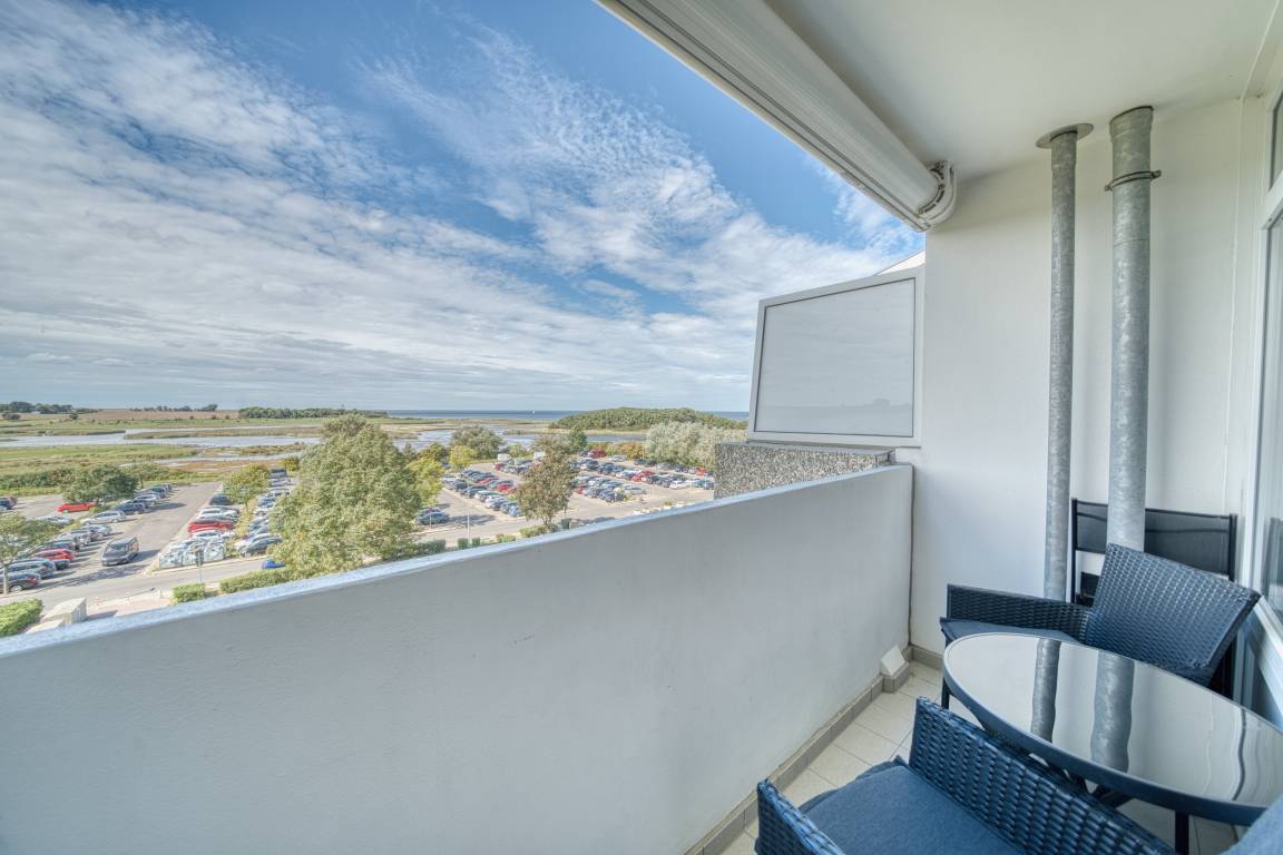 Erleben Sie entspannte Urlaubstage in dieser 45 m² großen Ferienwohnung in der 5. Etage des Hauses F im beliebten Ferienpark Heiligenhafen. Der Balkon zur Westseite bietet einen großartigen Blick auf die Ostsee und den Leuchtturm, ideal für stimmungsvolle Sonnenuntergänge am Meer.