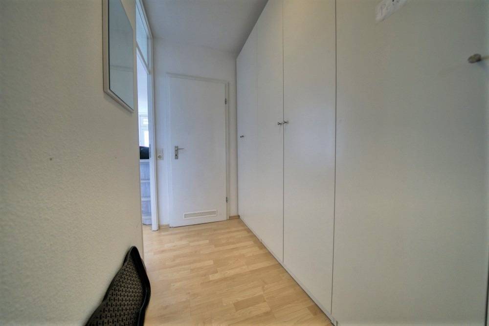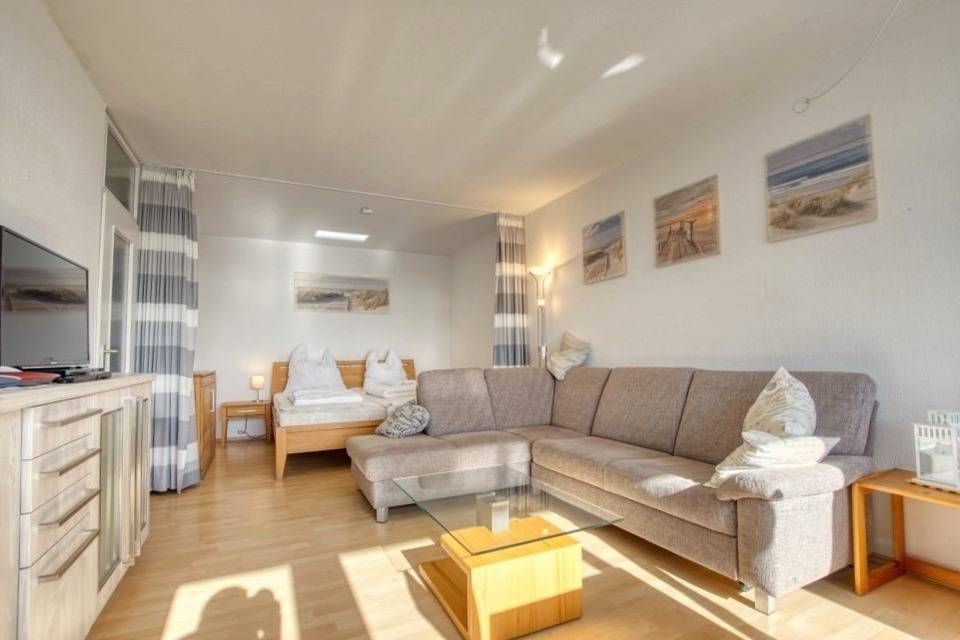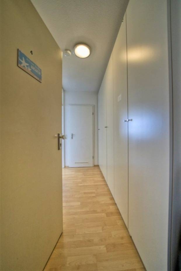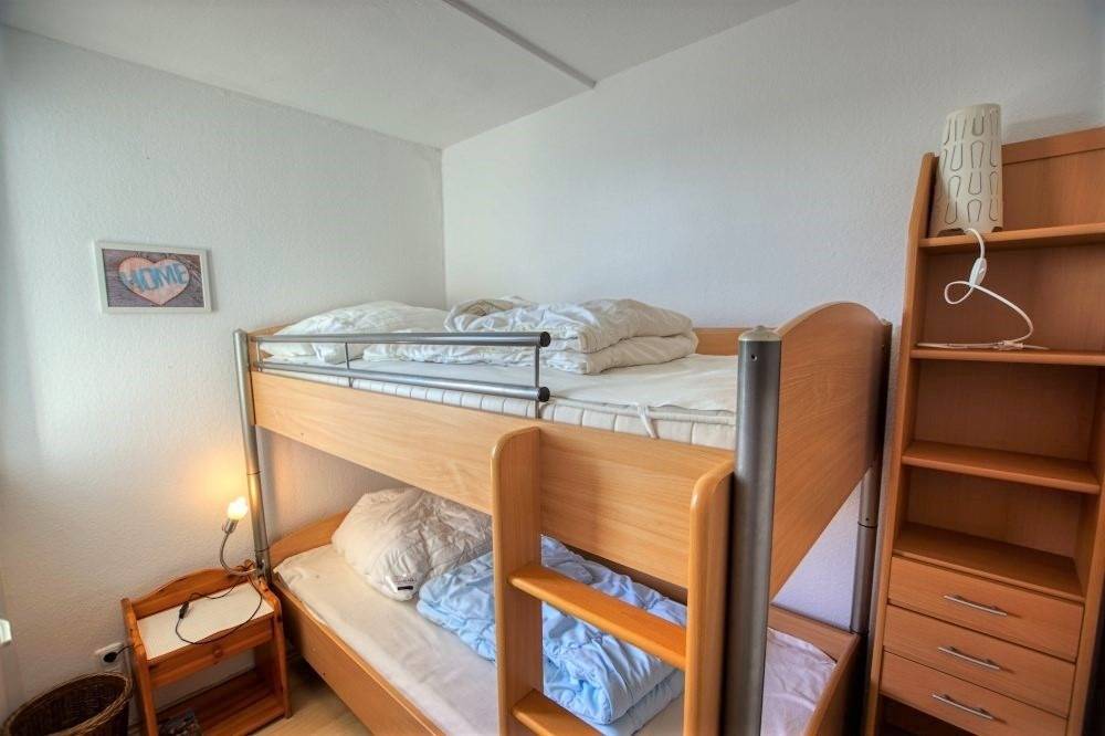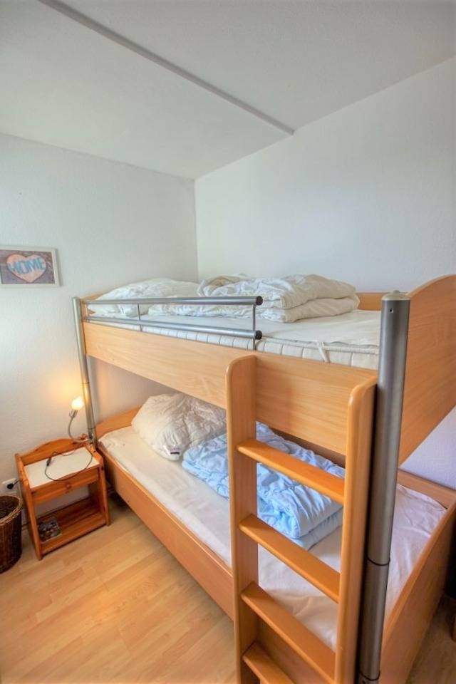 Die Wohnung verfügt über einen Wohn-/Schlafbereich mit Doppelbett und Schlafcouch sowie ein separates Kinderzimmer mit Etagenbett. Laminatboden und WLAN sind inklusive.