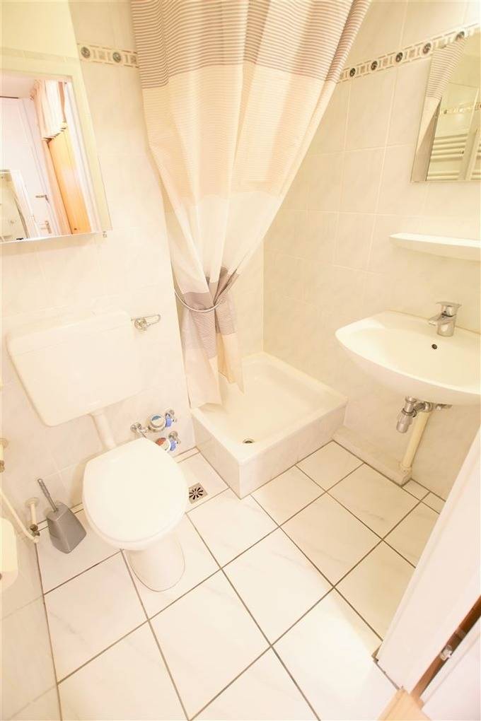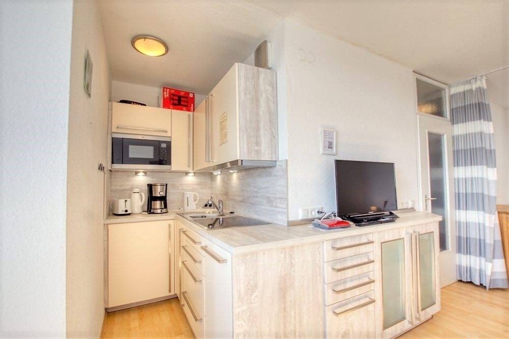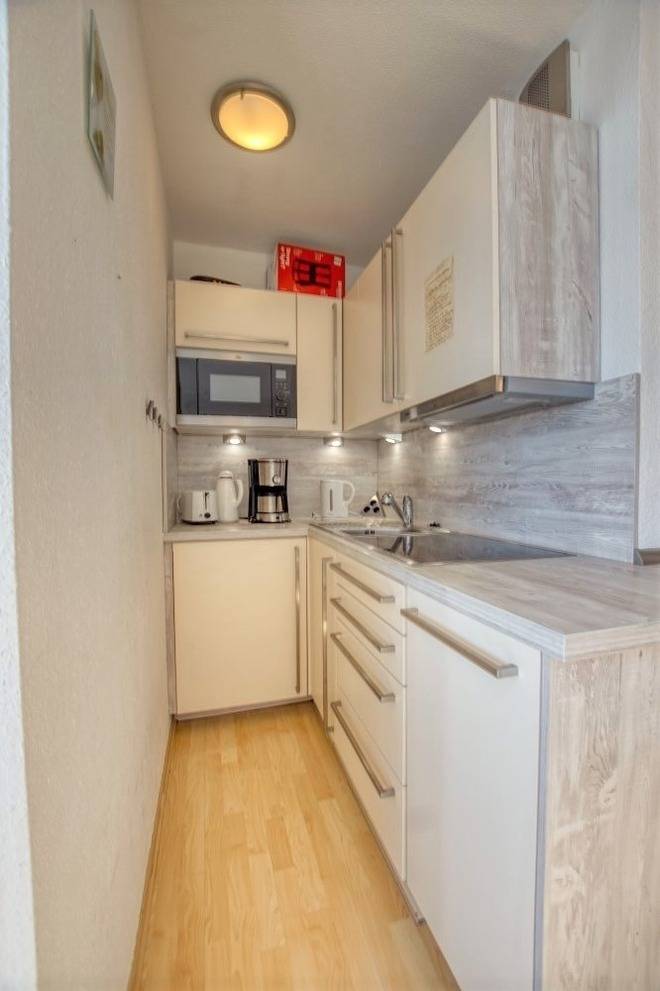 Die moderne Einbauküche ist ausgestattet mit Cerankochfeld, Mikrowelle, Kühlschrank mit Gefrierfach, Geschirrspüler, Toaster, Filterkaffeemaschine und Wasserkocher. Das Badezimmer verfügt über eine kompakte Duschkabine.