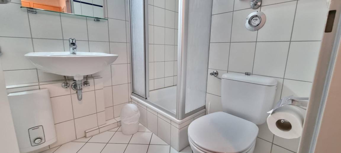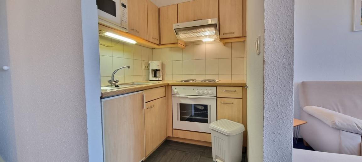 Die kleine, integrierte Küchenzeile ist funktional ausgestattet und eignet sich ideal für eine unkomplizierte Selbstverpflegung im Urlaub. Das Duschbad befindet sich im Vorflur und ergänzt die praktische Raumaufteilung.